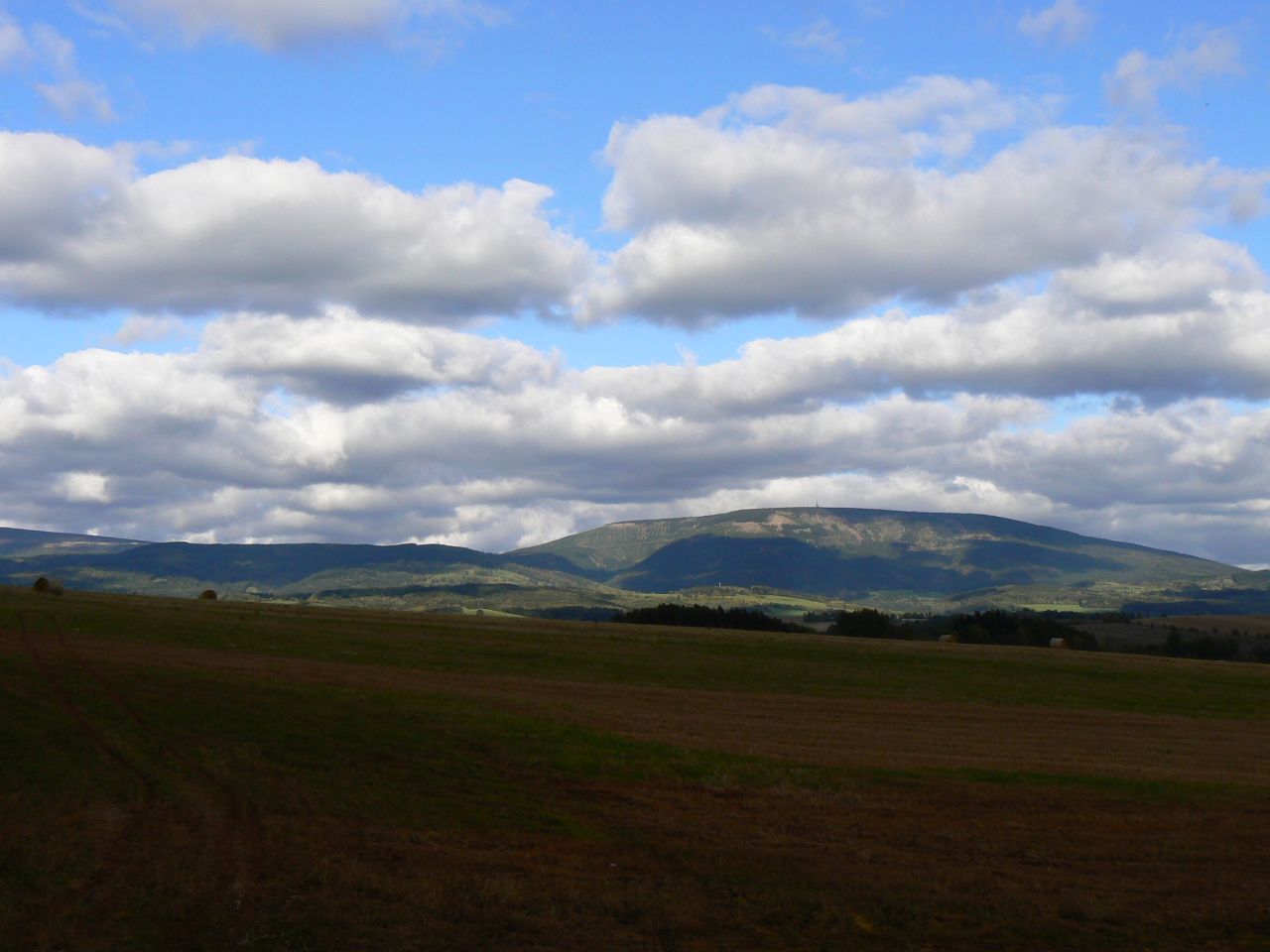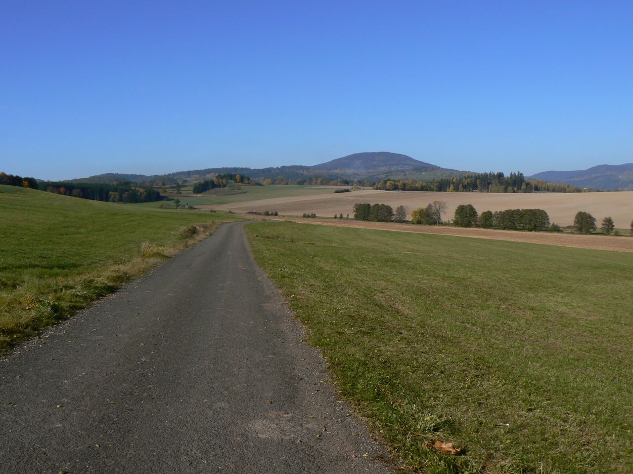 Přecházíme louku nad kunčickým hřbitovem až na silničku, po které se dáme vlevo a jdeme do Lánova. Jsou z ní nádherné výhledy na Krkonoše, ty jsou však bohužel dneska zamlžené, proto vám tu nabídnu obrázek z loňského 14. října.