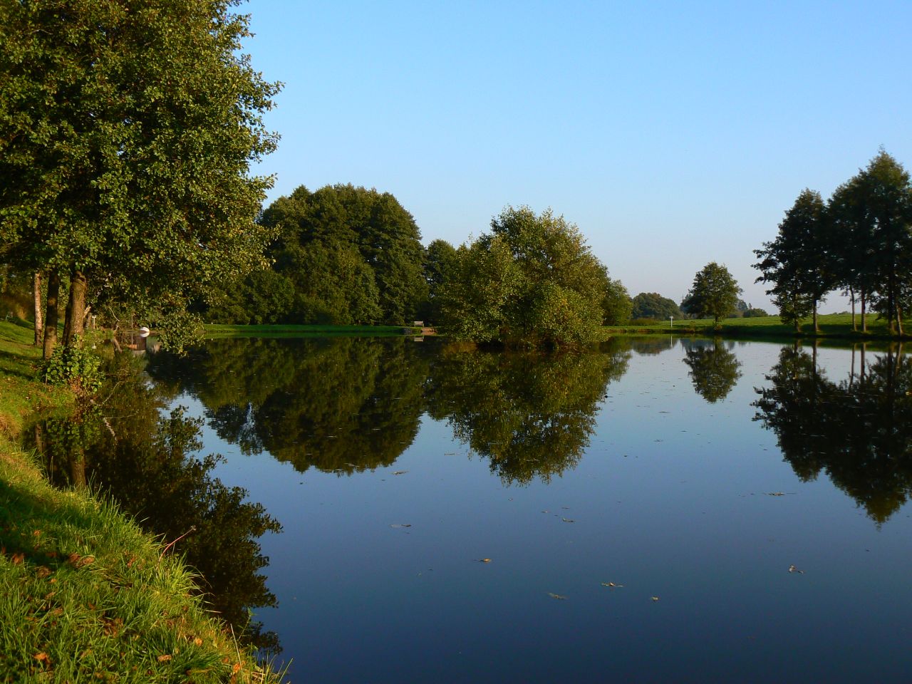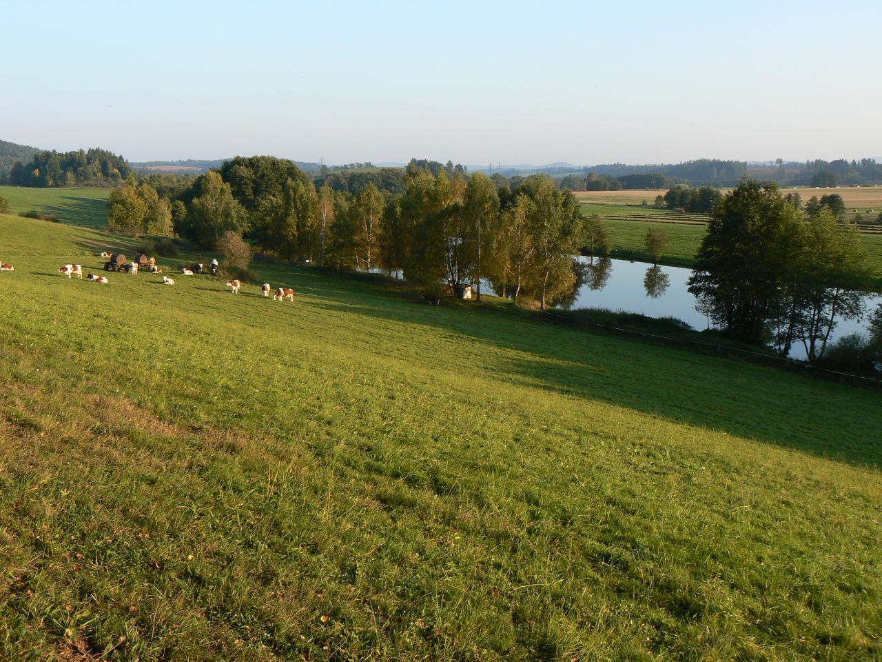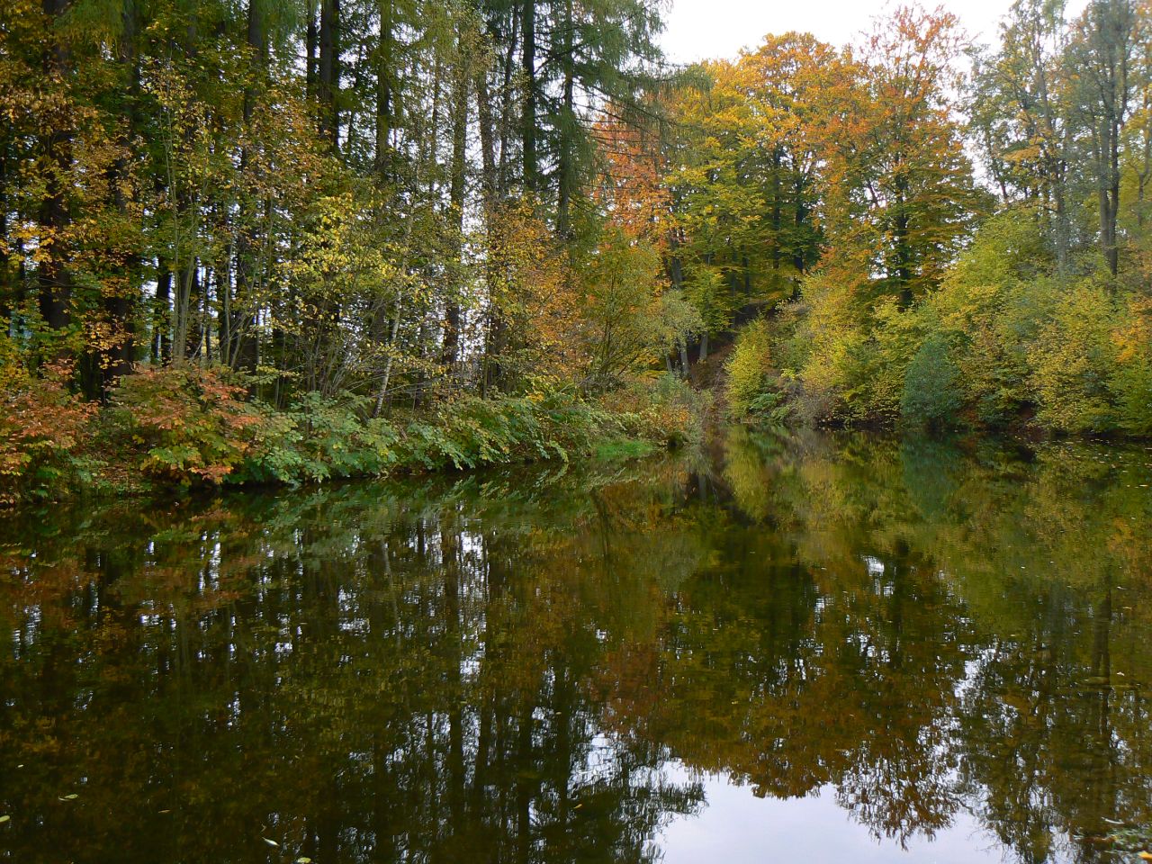 Paprsky podvečerního sluníčka zlatí protější stráň, z rybníku občas vyskočí rybička... a my si tu spokojeně jíme masovou konzervu s chlebem. Je tu hezky, jen kačenky tu kupodivu nejsou vůbec žádné. Asi se všechny odstěhovaly do Vrchlabí do zámeckého parku.