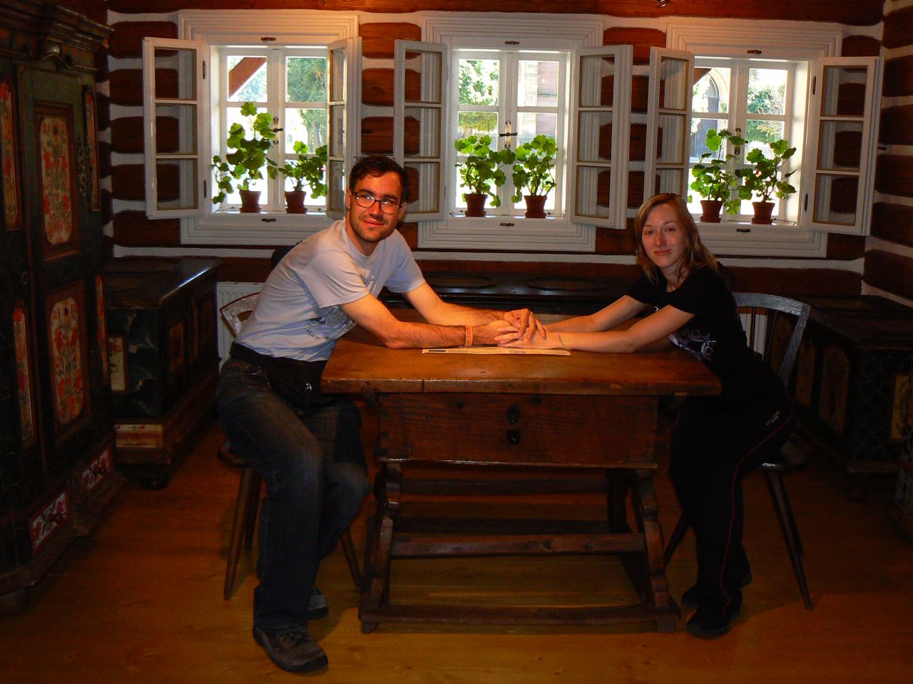 Přes chodbu vstupujeme do království nádherného krkonošského malovaného nábytku - skříní, truhel, lžičníků i almárek. Je vám tu dovoleno dokonce i usednout a u prastarého stolu se nechat vyfotografovat. Já tu jsem s mou milou kamarádkou Vlaďkou, se kterou jsem tu byl před čtrnácti dny.