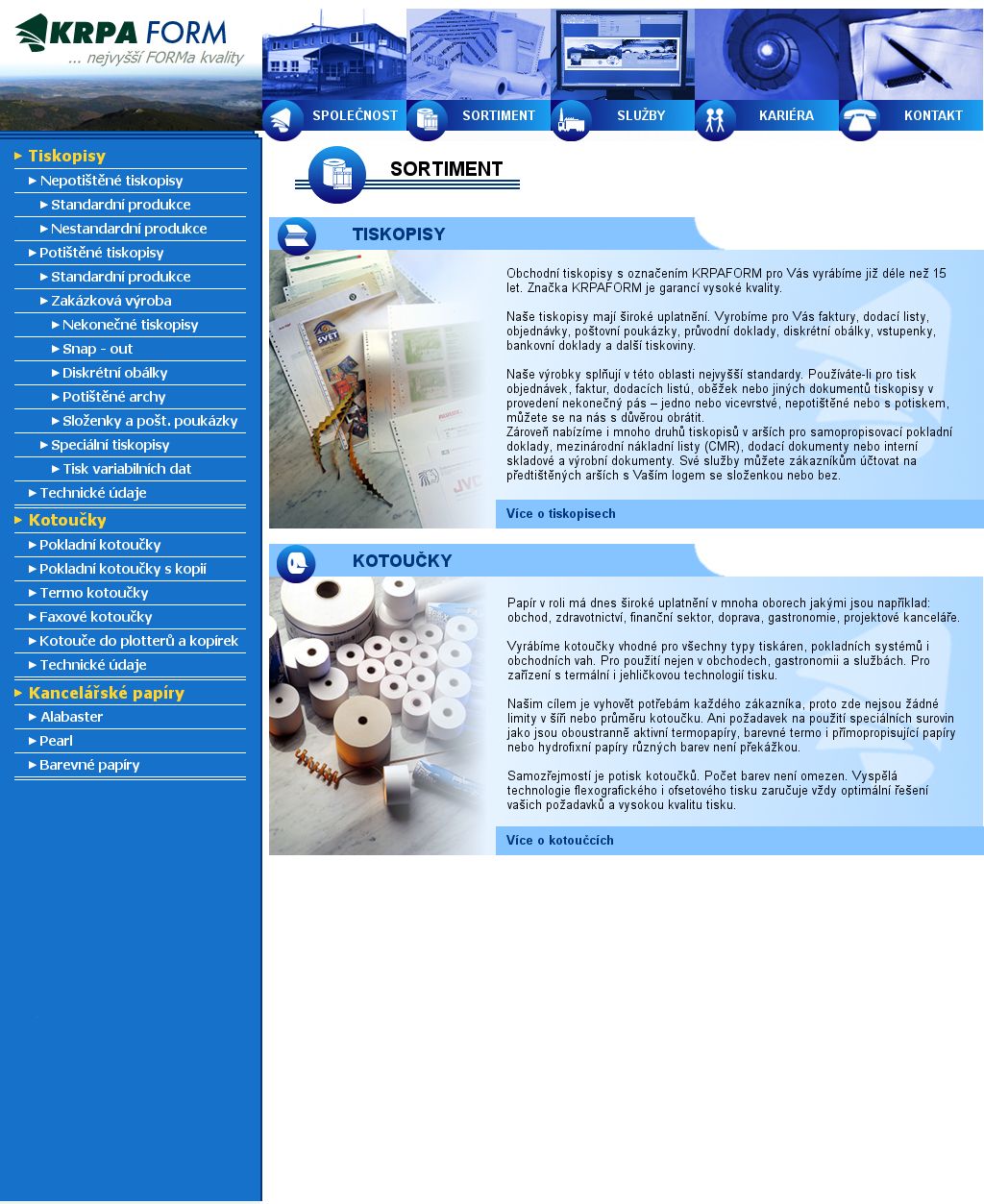 Dlouhý čas se Tomášův Internet stal mrtvou stránkou. Nechodilo na něj ani mnoho návštěvníků, ani já sám. Důvod byl jediný. Stránka mého zaměstnavatele - http://www.krpaform.cz - už dlouho nedoznala žádných změn, je na ní málo informací a většina je jich ve formátu PDF, ani vzhled stránky není nejpraktičtější, je tam příliš mnoho nevyužitého místa. Proto bylo rozhodnuto o tom, že se stránka musí předělat a byl jsem s tím společně s mými dvěma kolegy pověřený já. Na mě bylo vymyslet nový vzhled stránky, dlouho jsem si nad tím lámal hlavu, dostával se do slepých uliček, stahoval se a podnikal nové útoky, propukal v nadšení i propadal malomyslnosti, teď je ale všechno na dobré cestě.