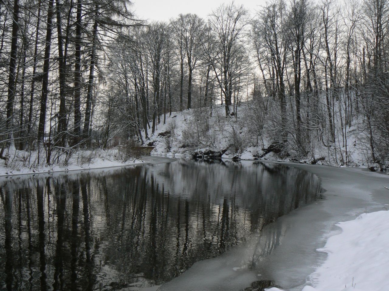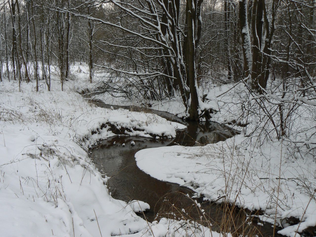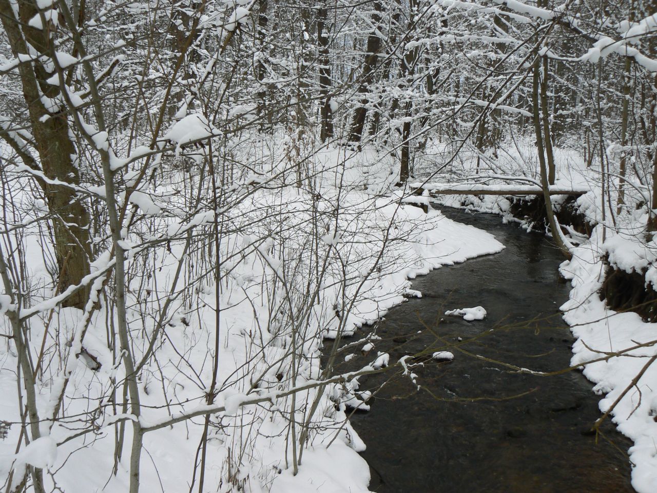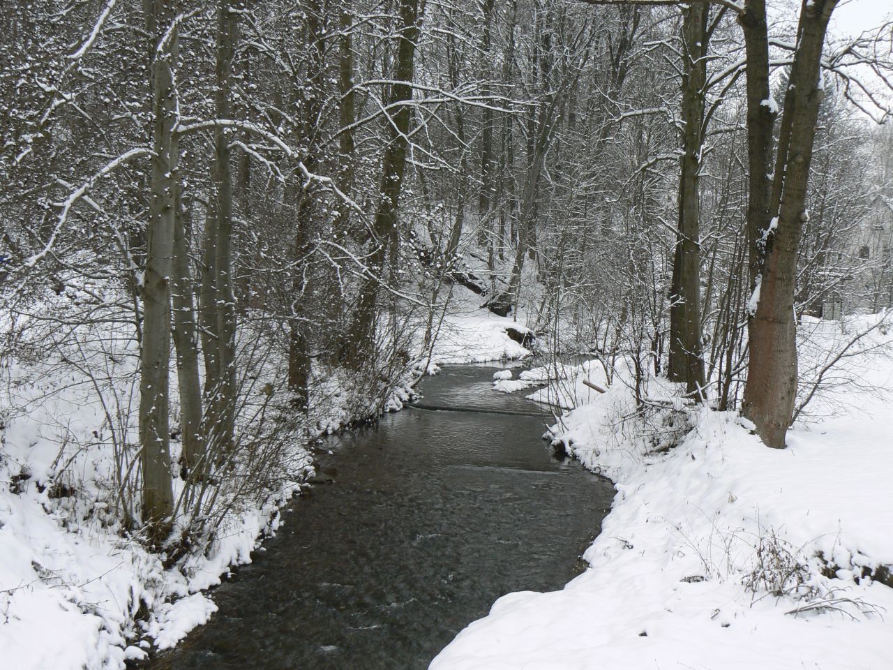 Zima však dokáže i odhalovat skrytá místa - meandry potoka Principálku jindy moc nejsou vidět, protože jsou skryté v hustém porostu kopřiv.