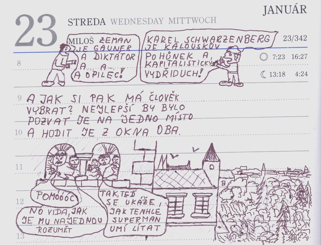 Panu Schwarzenbergovi u mě v posledních dnech velmi škodila nenávistná kampaň, kterou vedli jeho příznivci proti panu Zemanovi. Sem tam se k tomu přidávali se svou troškou i příznivci pana Zemana i pan Zeman sám. Až jsem své pocity vyjádřil obrázkem...