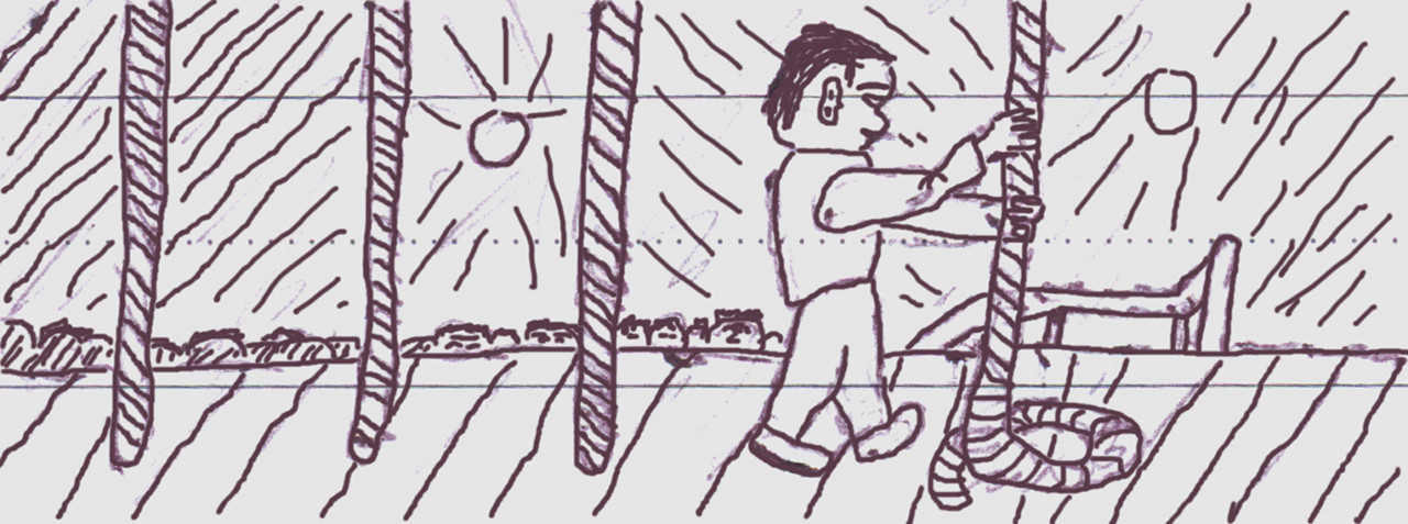 Naše malá skupina mužů a žen - tři kteři pirátili a tři od policie, kteří nás neoznámili a nepředali k potrestání - se dává na cestu k dřevěným schodům na pódium. Já jdu až poslední, vedle mě jedna z potrestaných policistek - těžce polyká a já jí pokládám ruku na rameno, zahalené bílou košilí. "Jen klid, tohle všechno je určitě jenom jako." Stoupáme pomalu po schodech z čerstvého, voňavého dřeva, přidržujeme se hladce ohoblovaného zábradlí, přecházíme odpočívadlo a několik dalších schodů nás přivádí na pódium. Šest lan tu je připravených, zavěšených na kladkách... a na konci mají oprátky.