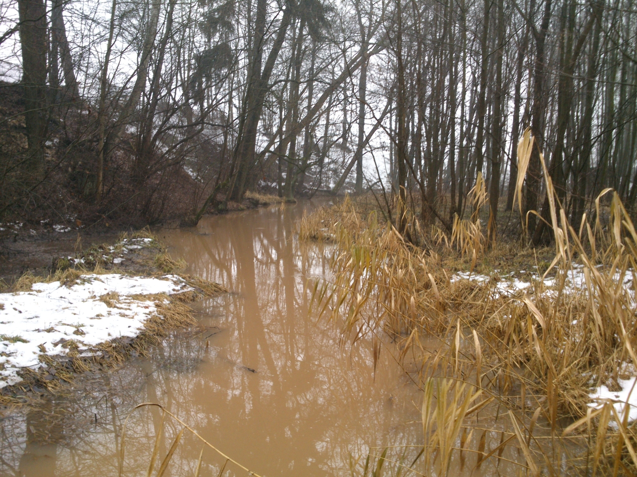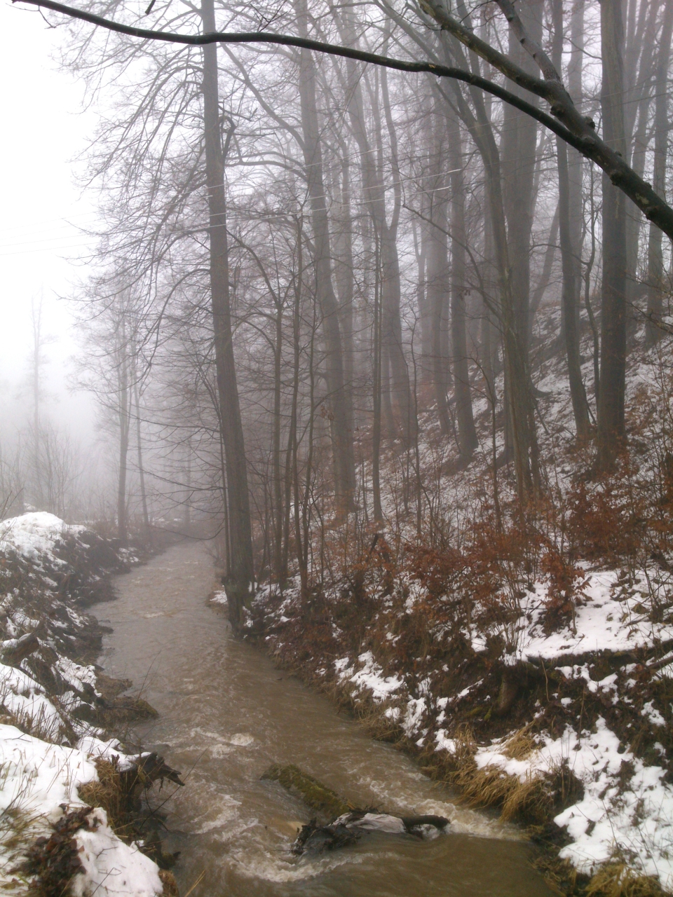 Údolí Principálku se pohroužilo do odstínů bílé, šedé a černé a jediné, co v něm má jinou barvu, je samotný potůček Principálek, posílený vodou z tajícího sněhu, splachující hlínu z polí.