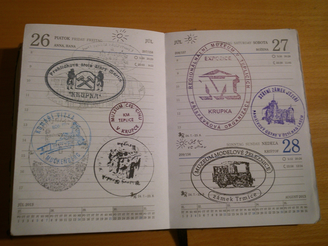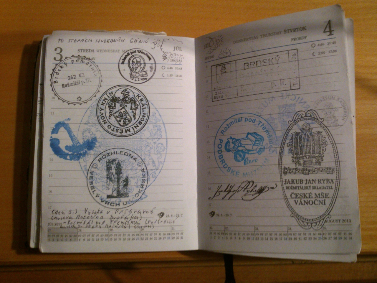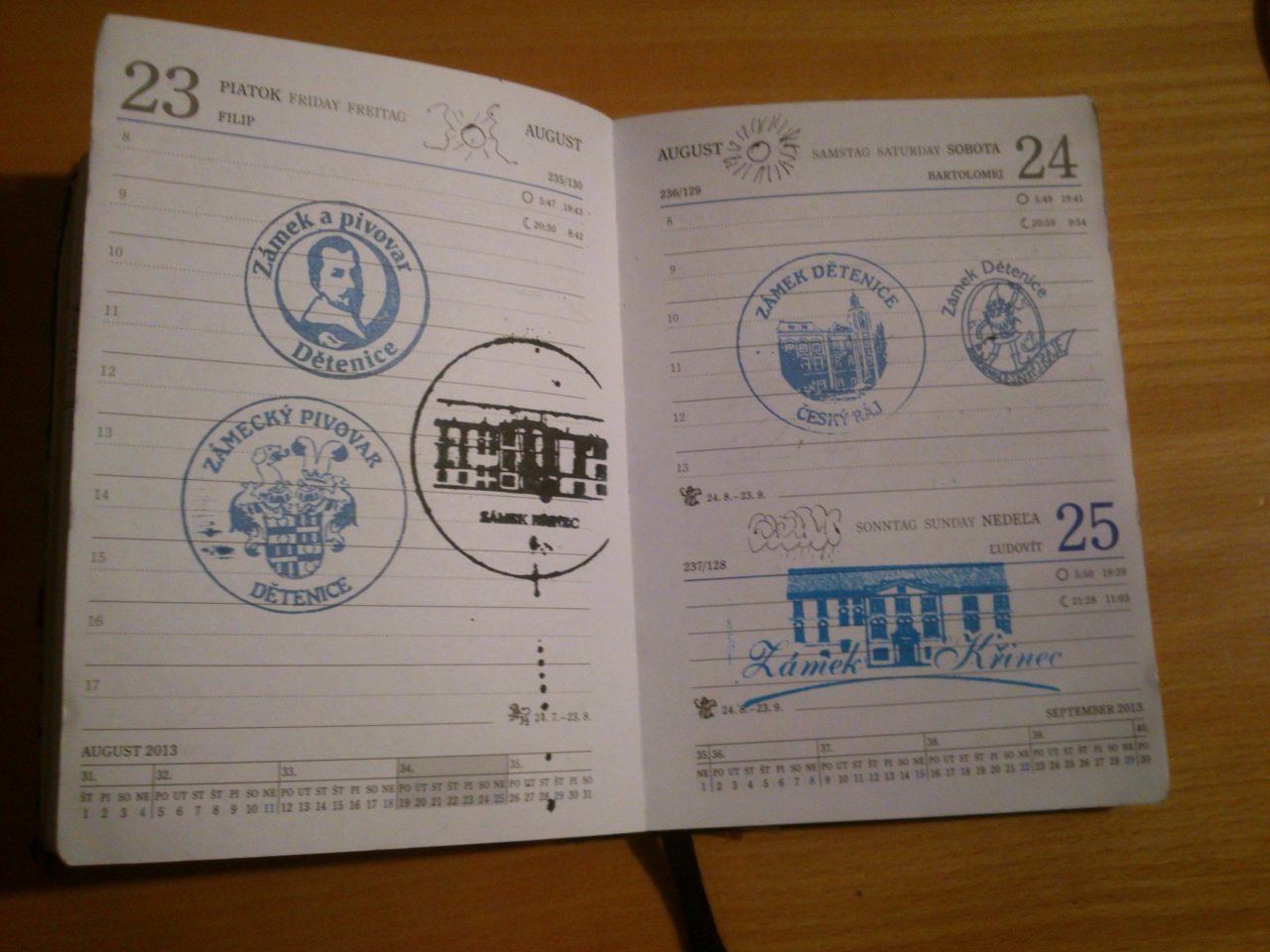 Své místo mají v diáříku i různá krásná razítka z cest. Třeba z první dovolené v okolí Příbrami...