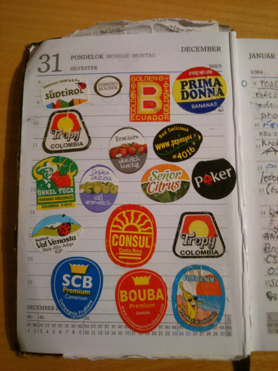 První stránka diáříku je už tradičně zasvěcena všem exotickým samolepkám, které se mi dostaly v průběhu roku do ruky.