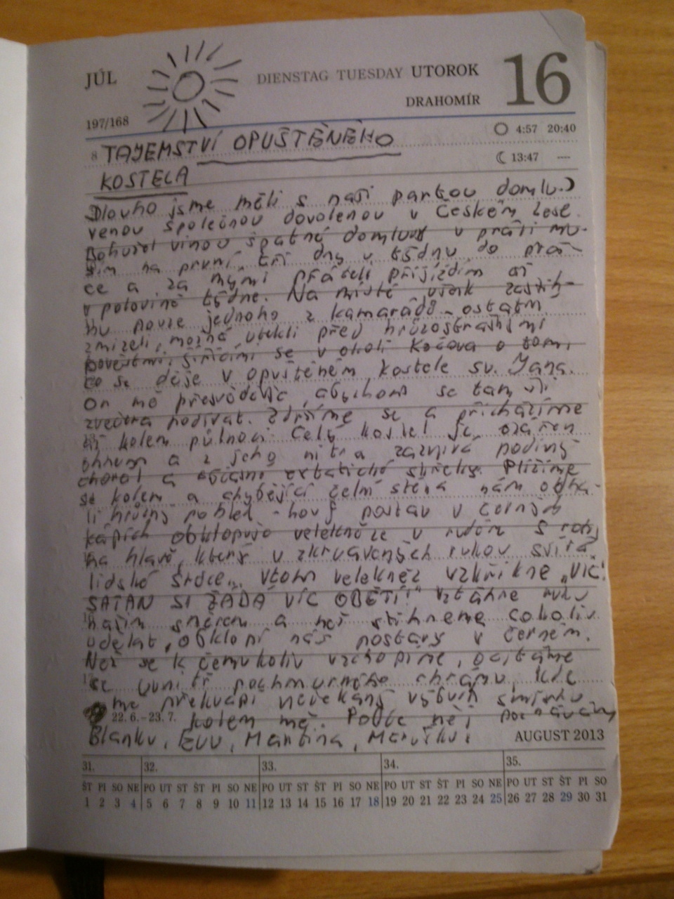 I když má diářík ještě stránky pro zbytek týdne, pro tenhle rok jsme na jeho poslední stránce. Dívám se na ni a napadají mě úplně stejné myšlenky, jaké mě napadaly loni. Že se to nezdá tak dlouho, co jsem listoval čistým diáříkem a zkoušel si představovat, co asi na nich bude. I dnes listuju týmž černým diáříkem od Anny, na kterém je vidět, že se mnou putoval celým rokem. Mám ho o to radši.
