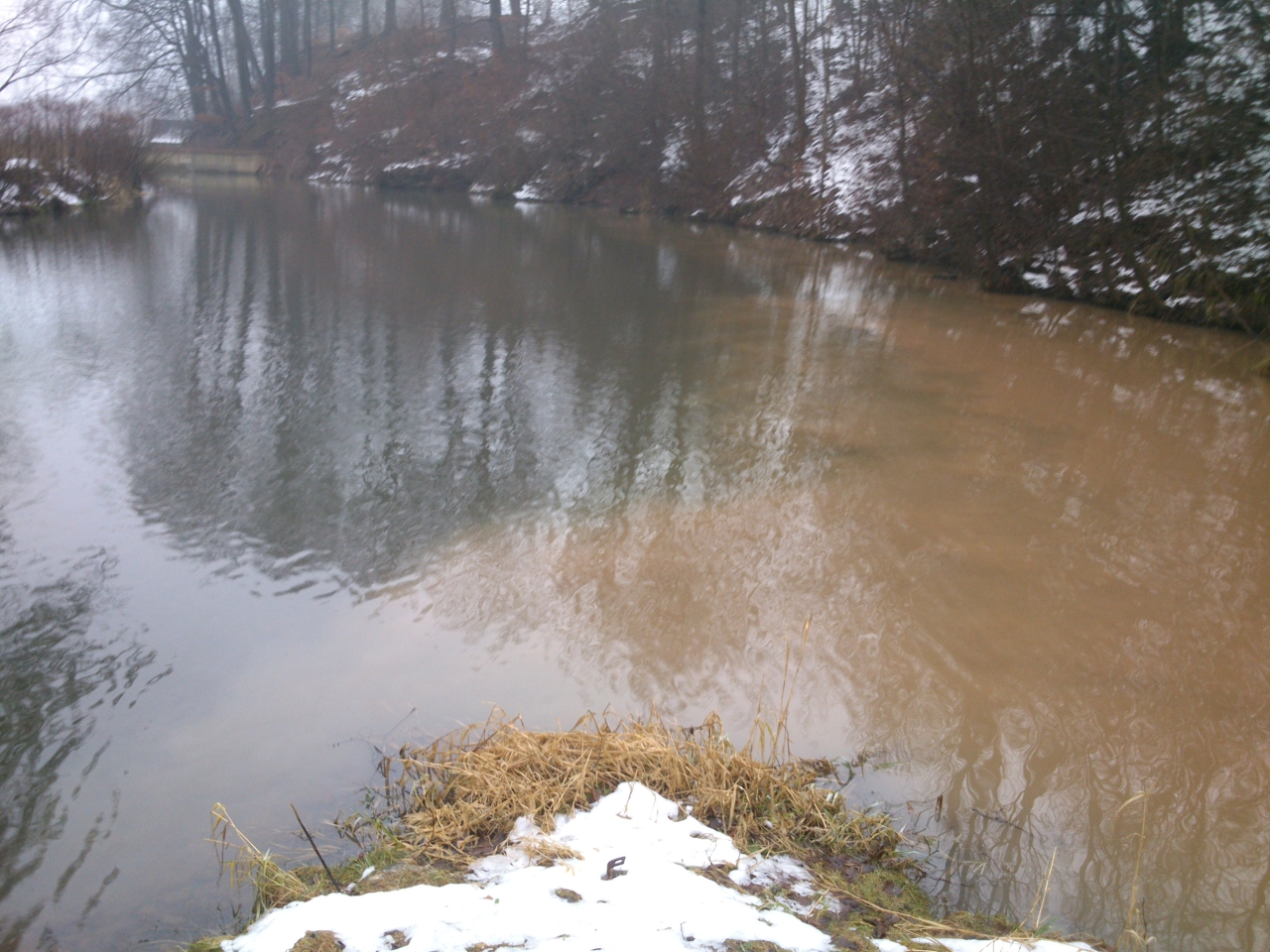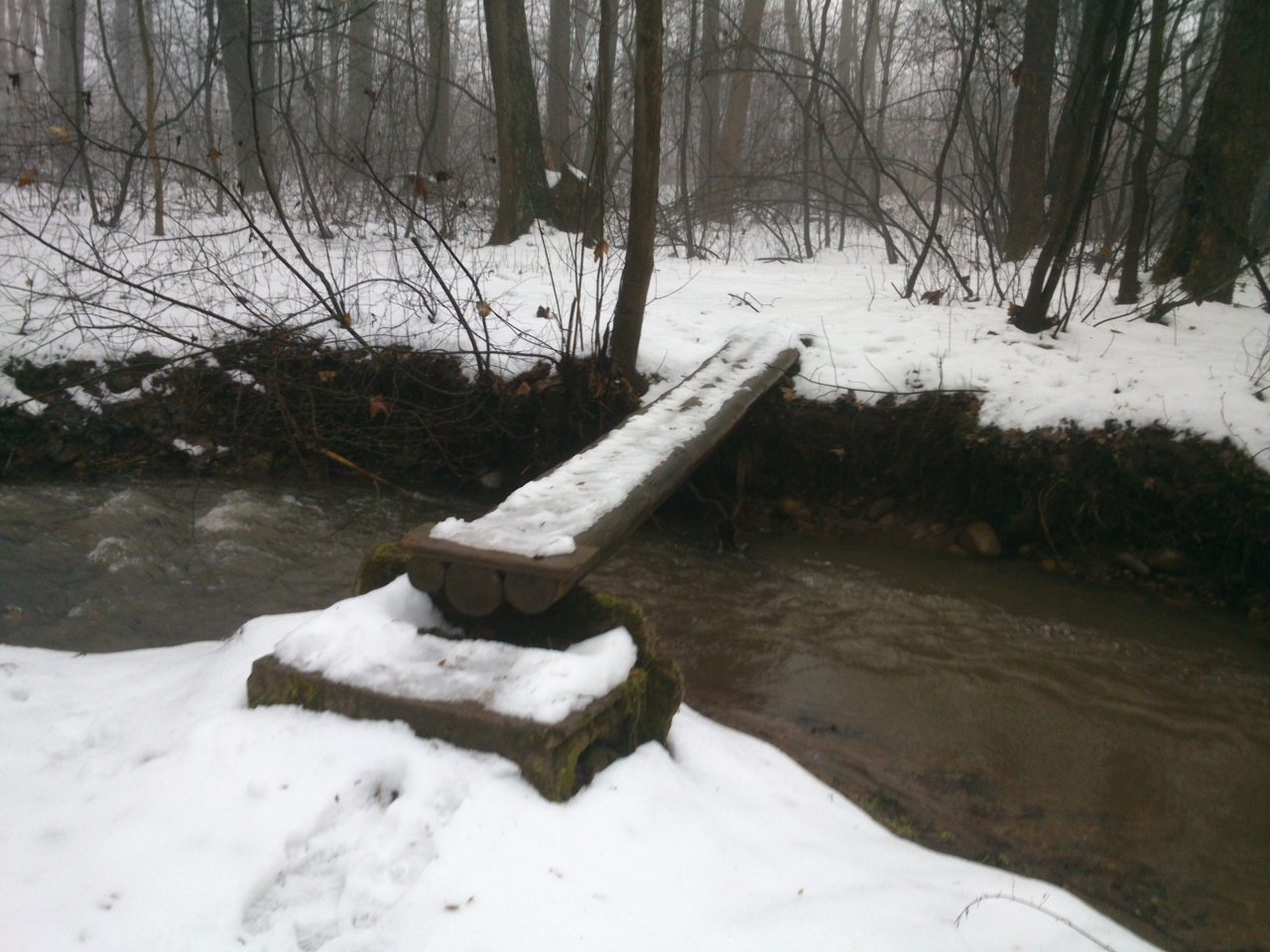 Na něm je sníh a led, pod ním propast na jejímž dně bouří dravé vody, které by spolkly spadnuvšího jako malinu. :o) Měl jsem v sobě nejisté pocity při přecházení, ale dobře to dopadlo, koupel v ledové vodě se nekonala a já tak můžu spokojeně jít zimním lesem a fotografovat hezký meandr Bělé, který teď hezky vynikne, protože je v Bělé hodně vody z tajícího sněhu.
