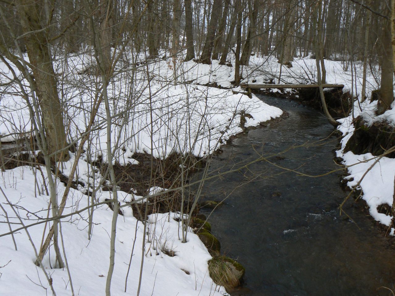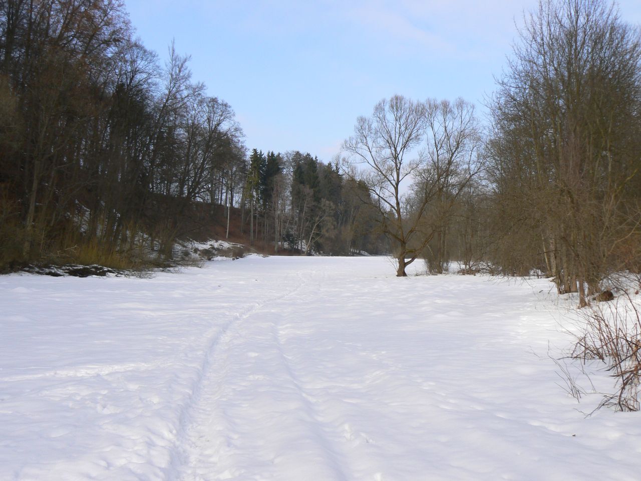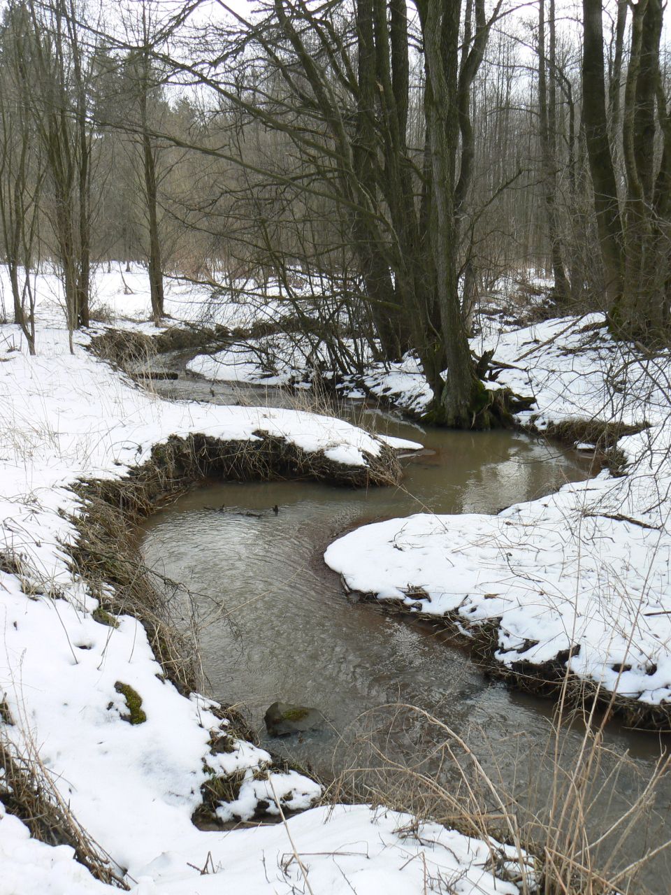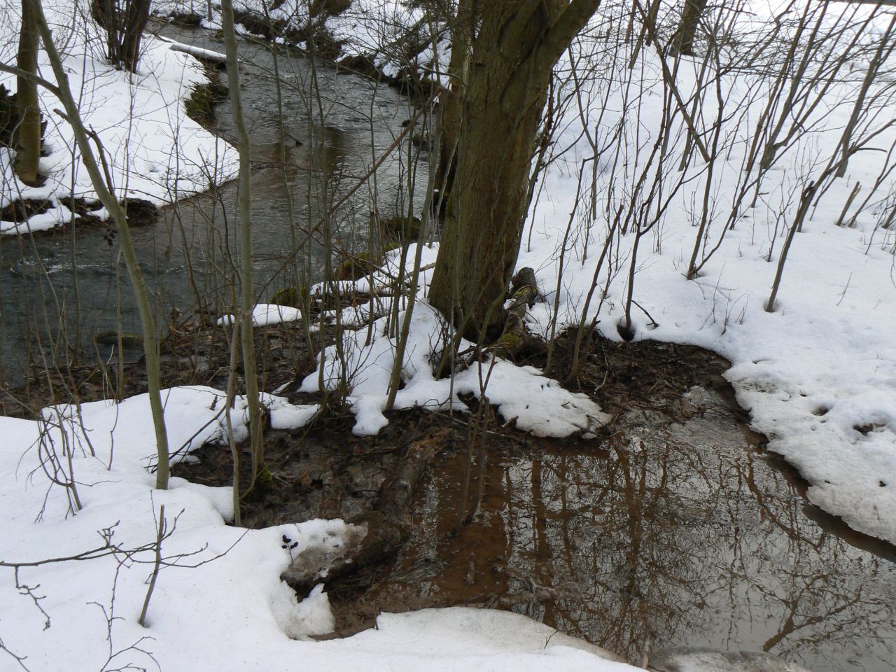 ...klidný potok Principálek je ještě zčásti zamrzlý.