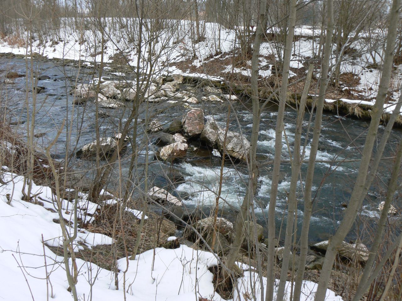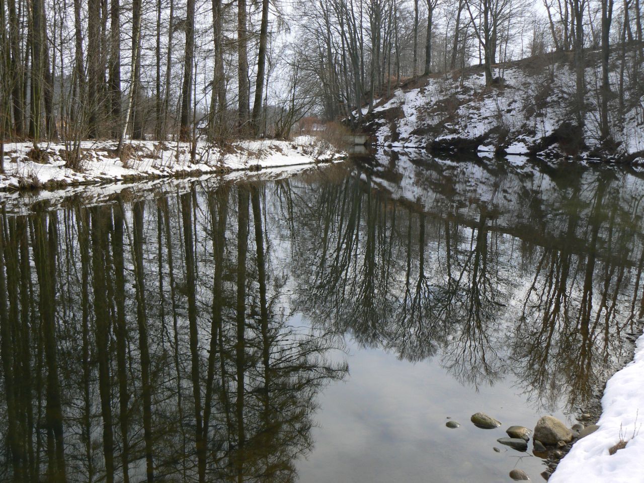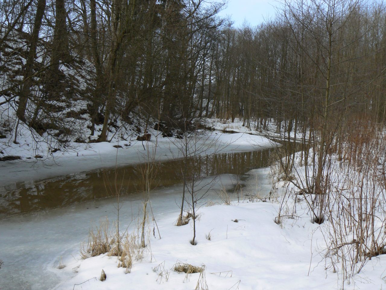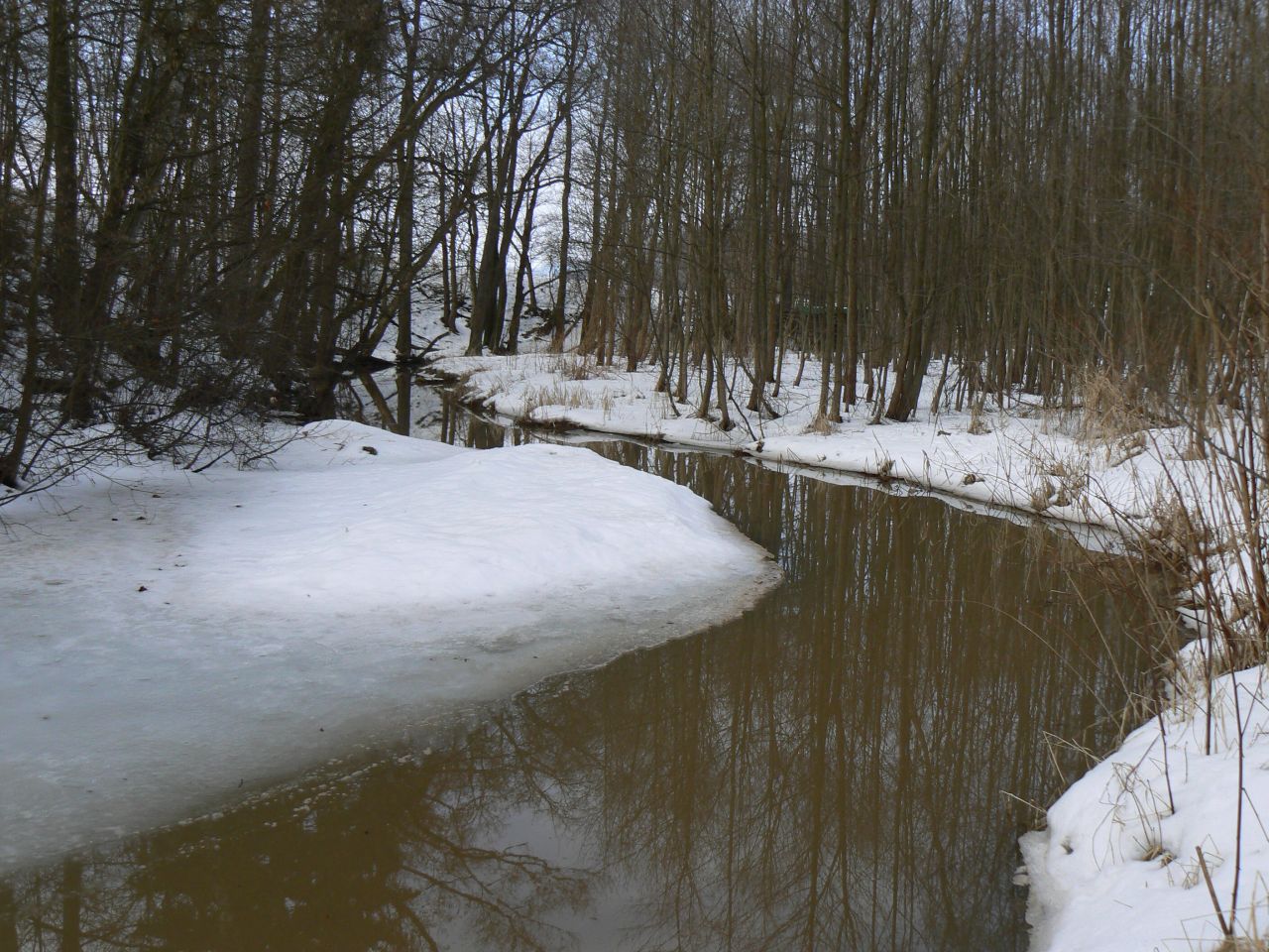 ...klidný potok Principálek je ještě zčásti zamrzlý.
