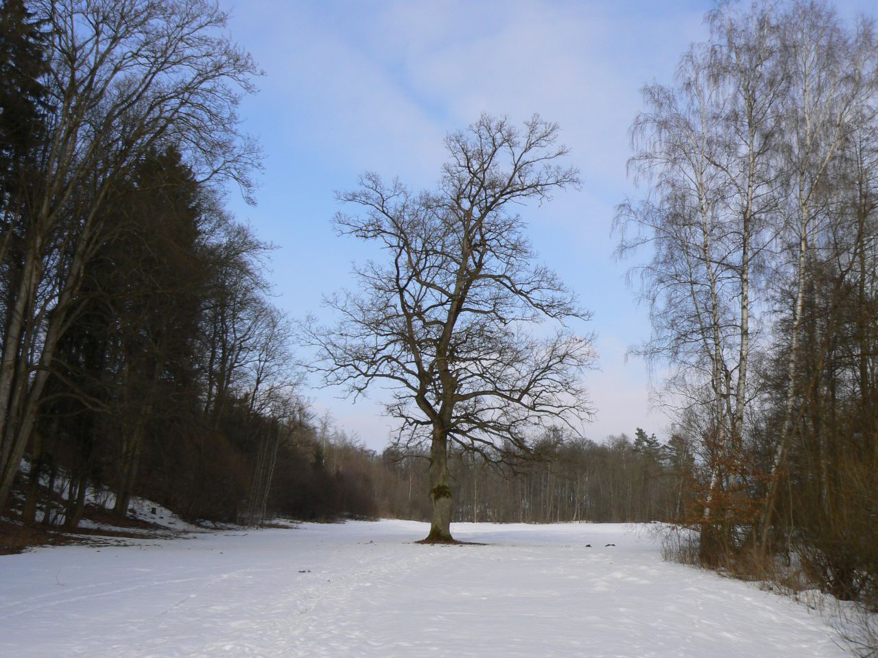 Starý dub si tak, jako všechny stromy v zimě, svým teplem vytvořil kolem sebe holé místo.