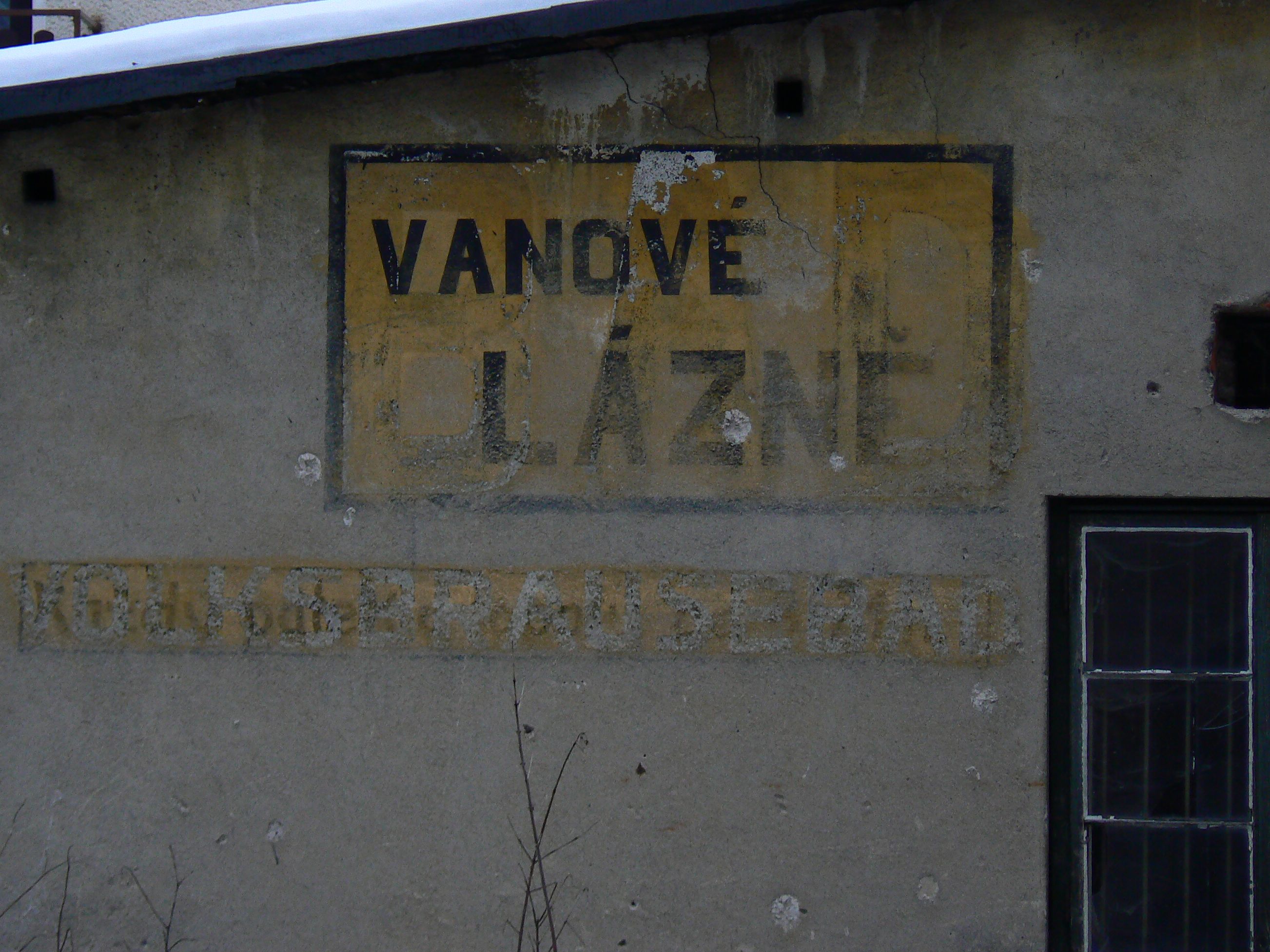 Dominantní je černý nápis na žlutém pozadí VANOVÉ LÁZNĚ, pod tím je k přečtení nápis, vyškrábaný do žluté barvy VOLKSBRAUSEBAD.