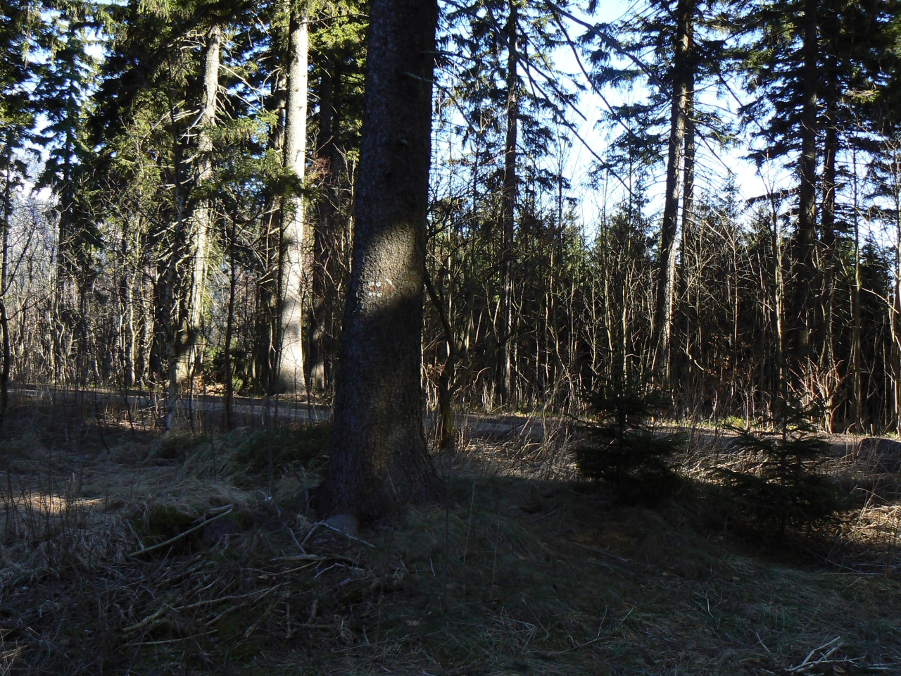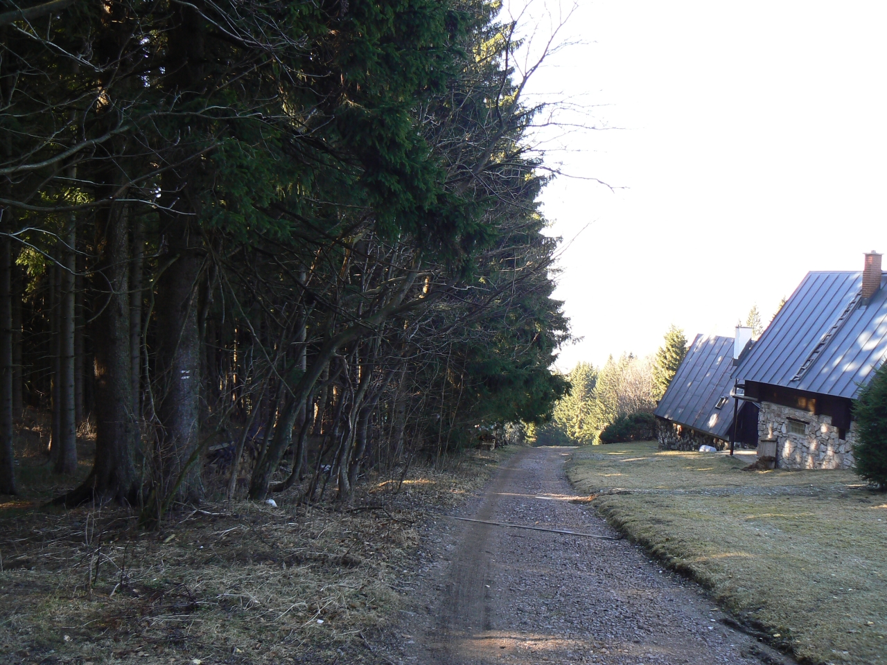 Za posledními chatami se stáčí poměrně nenápadná cesta doprava, podchází chaty a pokračuje do lesa. Dnes po ní lidé asi moc nechodí, ale stále je dobře znatelná. Před 17ti lety tu byla spousta zbytků značek, ale všechny byly zamalované hnědou barvou, která dnes nějak splynula s kůrou stromů a já nemůžu najít ani jeden. Orientace však není složitá - pokračujeme v chůzi po cestě až na křižovatku lesních cest a na ní se dáváme vlevo po širší lesní cestě, pokračující dál z kopce. Když se po naší levé ruce objeví louka, vedení zamalovanou šipkou odbočíme doleva po jejím okraji, sejdeme dolů a na spodním konci pokračujeme lesní cestou dál z kopce.