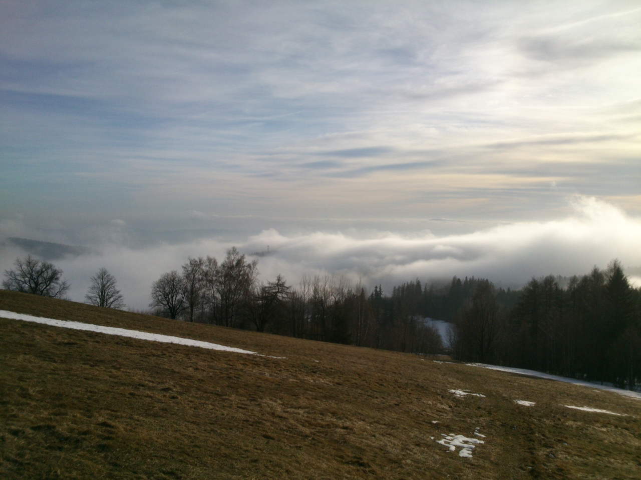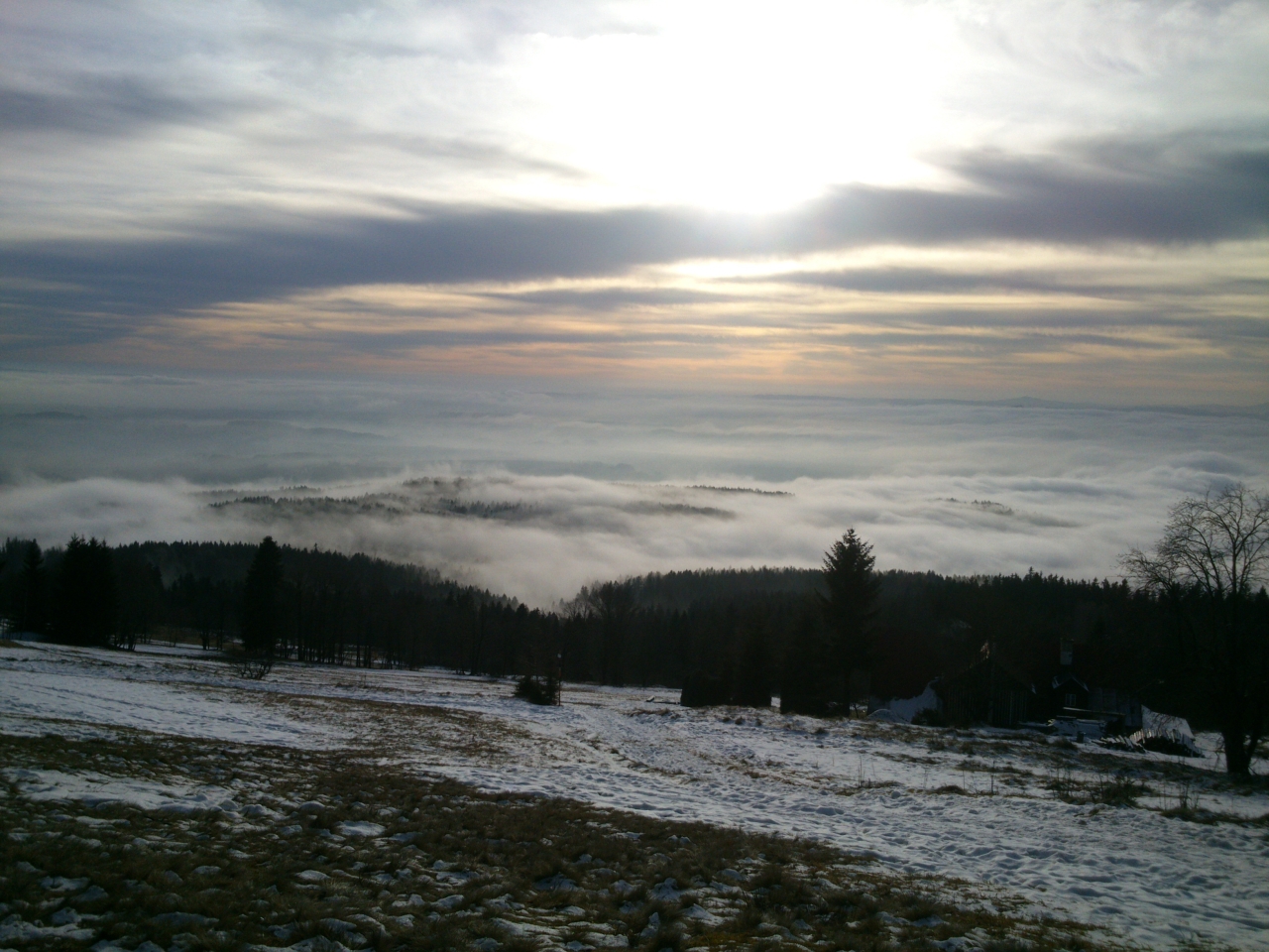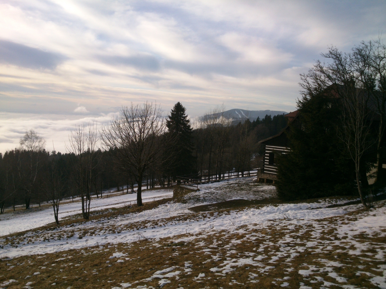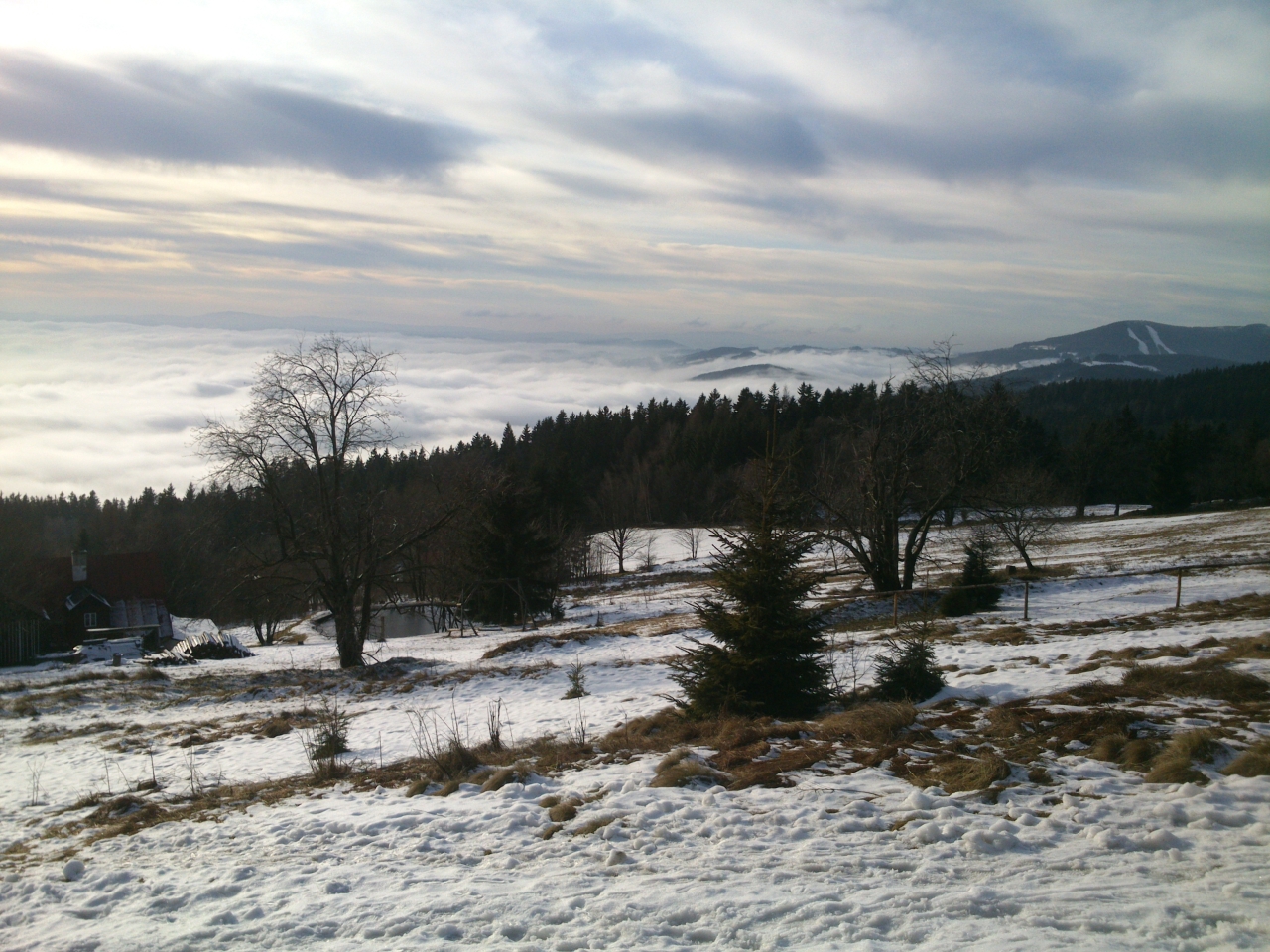 V okolí Bönischových bud je několikero sjezdovek a vleků, ale vinou letošní mírné zimy bez sněhu je sníh jen na jedné, kterou zasněžili sněžnými děly. Lyžaři se tu ale v dnešním slunečném dni jen hemží a užívají si sjezdu z Bónischových bud do duchny zvířených mračen. Dole v Černém Dole nasednou na lanovku a za chvíli jsou zpátky, aby mohli znovu radostně sjíždět. Já chvíli postávám u oblíbené lavičky a stolečku u nejvyšší z Bönischových bud a pak se pomalu vydávám na zpáteční cestu. Oblačné moře vybilo minulým náporem svou sílu a teď se jeho vlna stahuje před očima.