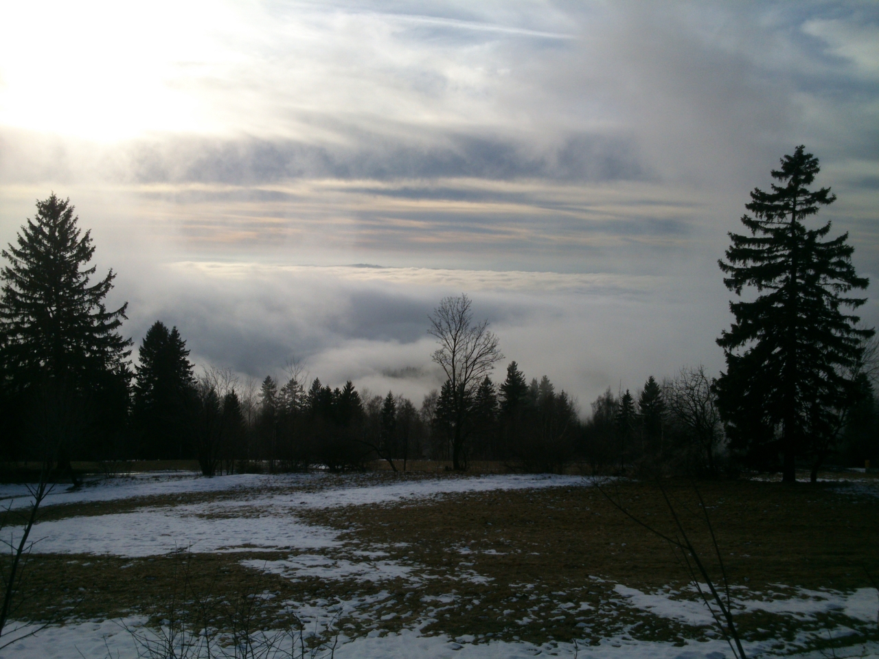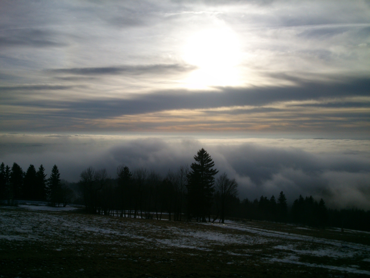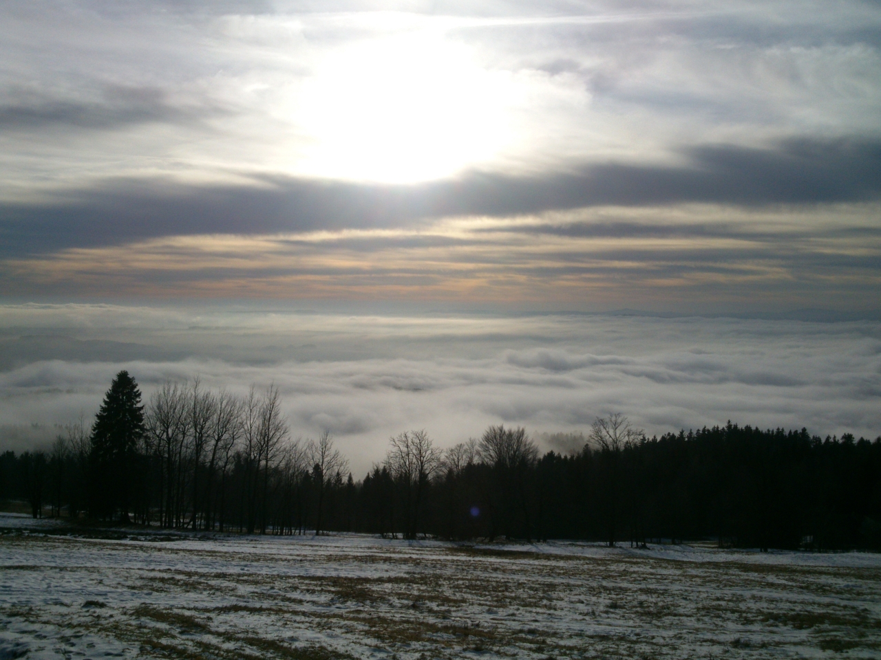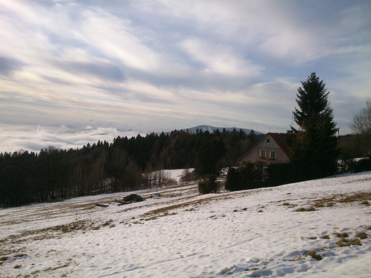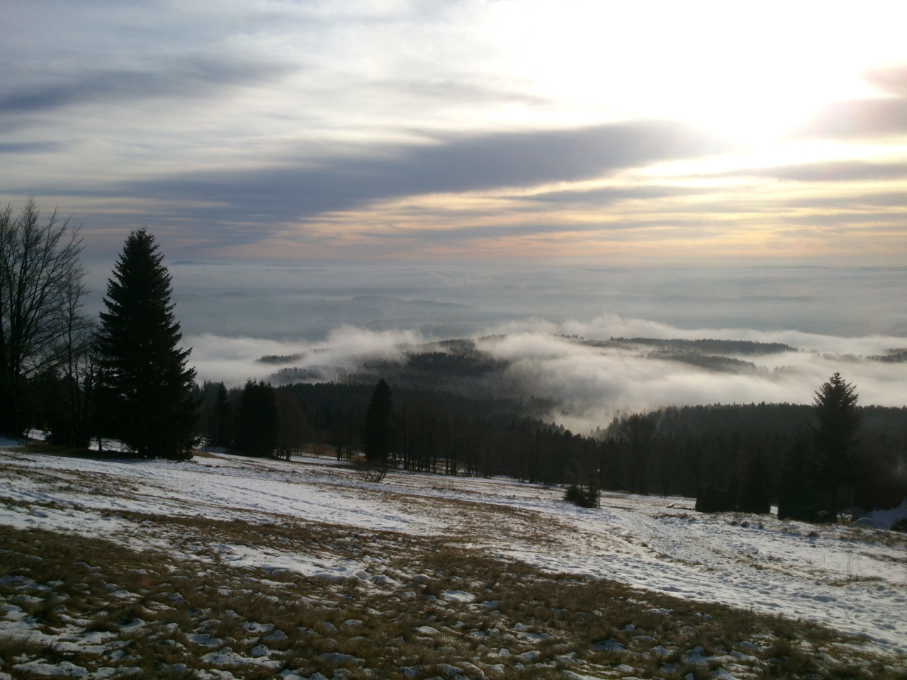 V okolí Bönischových bud je několikero sjezdovek a vleků, ale vinou letošní mírné zimy bez sněhu je sníh jen na jedné, kterou zasněžili sněžnými děly. Lyžaři se tu ale v dnešním slunečném dni jen hemží a užívají si sjezdu z Bónischových bud do duchny zvířených mračen. Dole v Černém Dole nasednou na lanovku a za chvíli jsou zpátky, aby mohli znovu radostně sjíždět. Já chvíli postávám u oblíbené lavičky a stolečku u nejvyšší z Bönischových bud a pak se pomalu vydávám na zpáteční cestu. Oblačné moře vybilo minulým náporem svou sílu a teď se jeho vlna stahuje před očima.