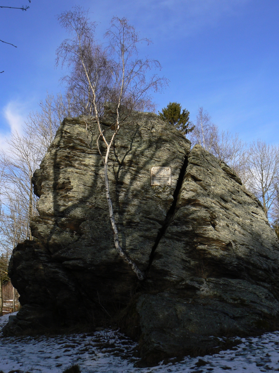 Na skále je pamětní deska...