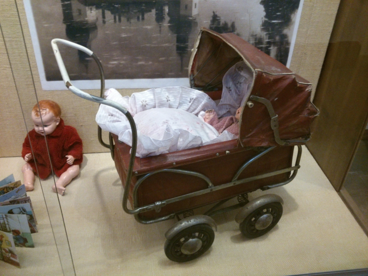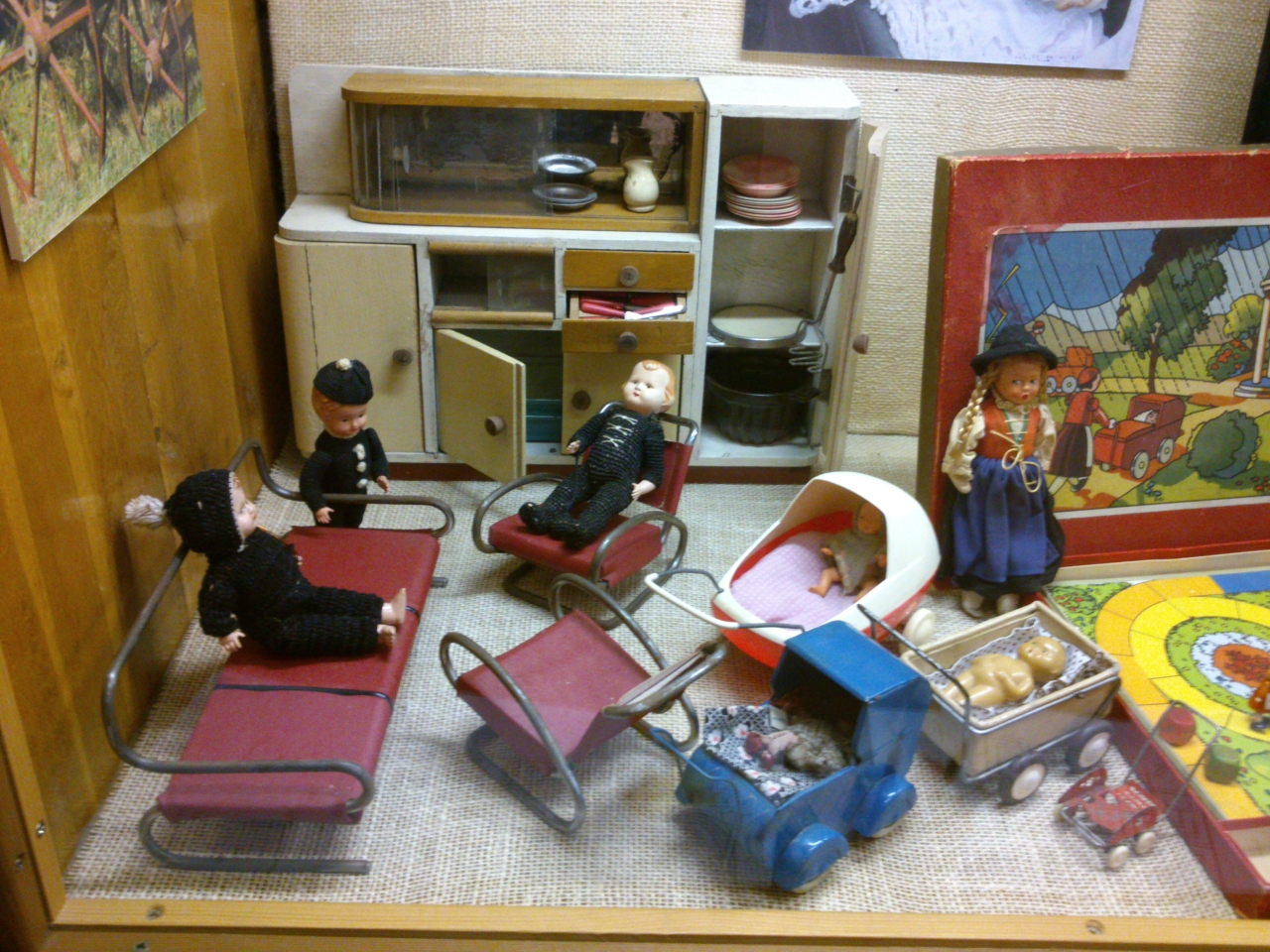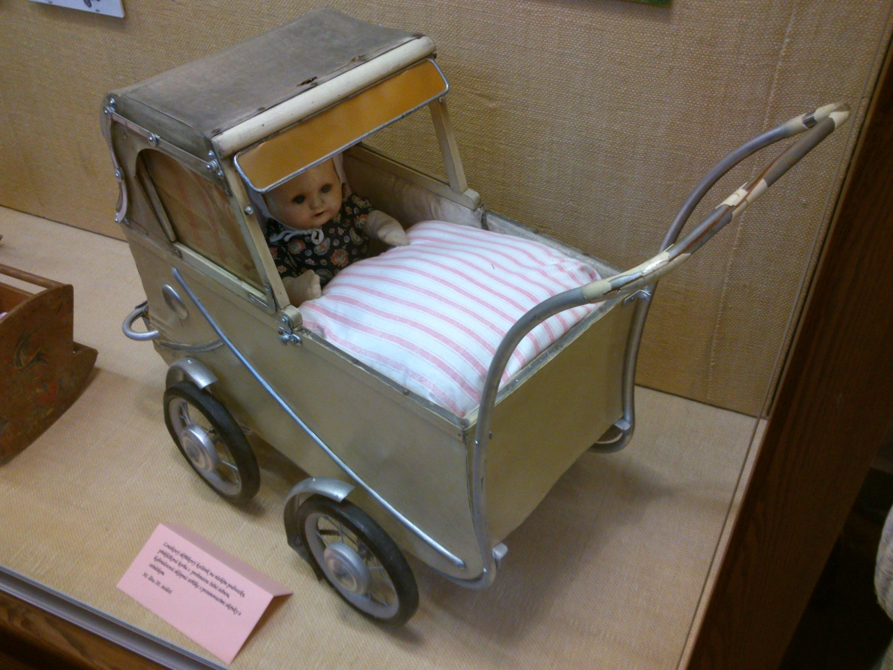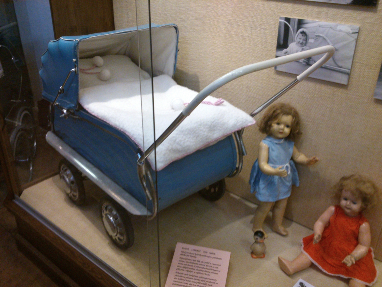 Výstava je tu díky milé paní, která se jmenuje Věra Čížková a jejíž vášní se kromě kočárků staly i panenky a jiné hračky.