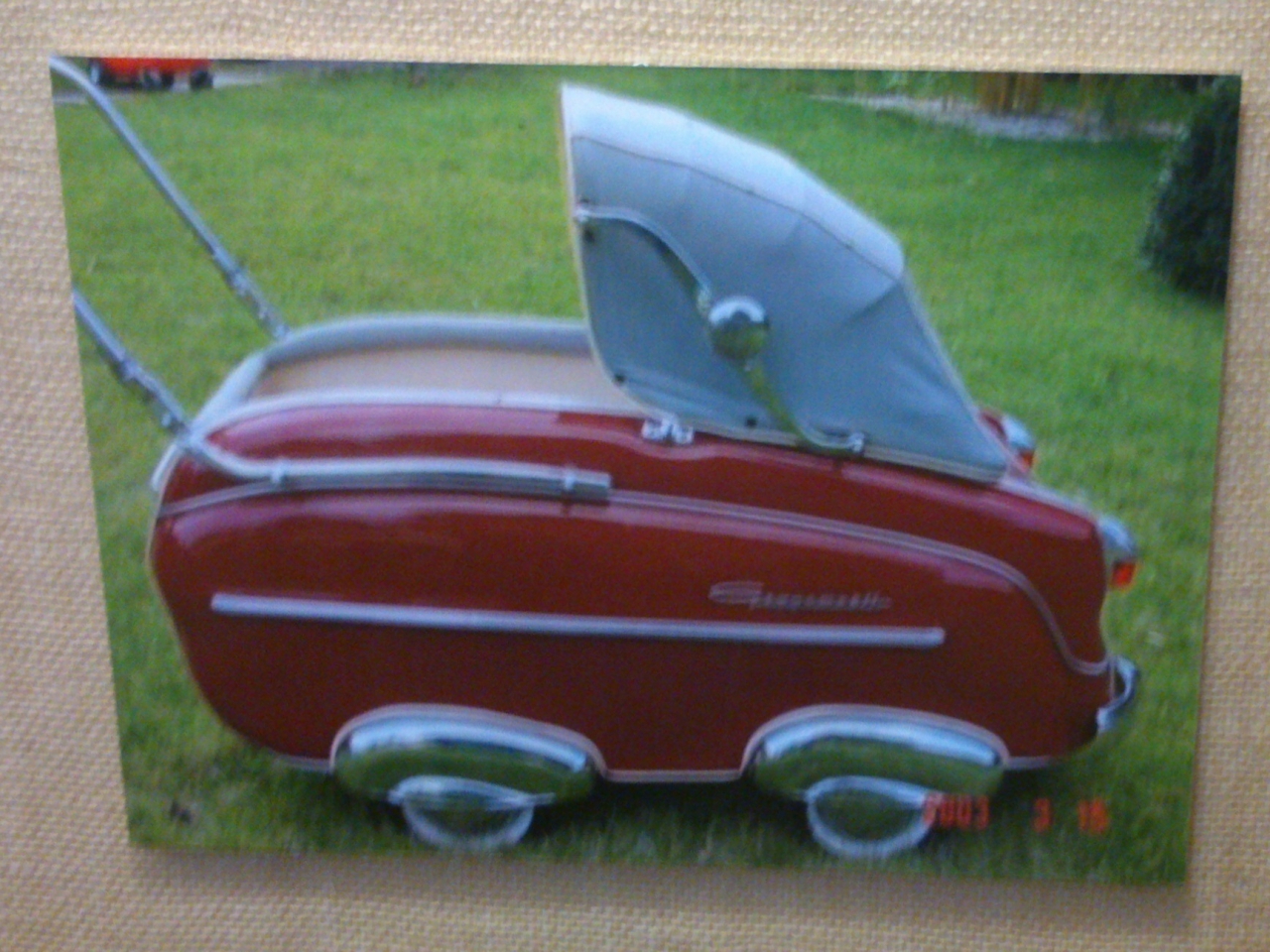 A v takovémhle sporťáčku, co je z něj napravo jen boudička, jsem jezdil i já, jen byl temně zelený a skrz jeho okénko toho nebylo moc vidět, což mě štvalo - skrz okénko nebylo vidět a dopředu jsem viděl jen mamku. Štvalo mě to, ale později téhož dne, co jsem spřádal tyhle myšlenky, jsem viděl až příliš. Mamka zaparkovala kočárek před dvojobchodem "DĚTSKÝ TEXTIL" a "KLOBOUKY, KOŽICHY", řekla mi "Já hned přijdu." a zabouchly se za ní dveře nalevo. Všechno by bylo v klidu a míru, kdyby se hned vedle neobjevila obluda, ze které jsem v té době měl nefalšovanou hrůzu - popelářské auto. Rachotilo, popeláři třískali popelnicemi, ale přesto to nebyl ten největší zdroj kraválu - tím jsem byl já, protože jsem vřískal, co mi hlas stačil. Zbytek vzpomínek už pohltilo zapomnění.