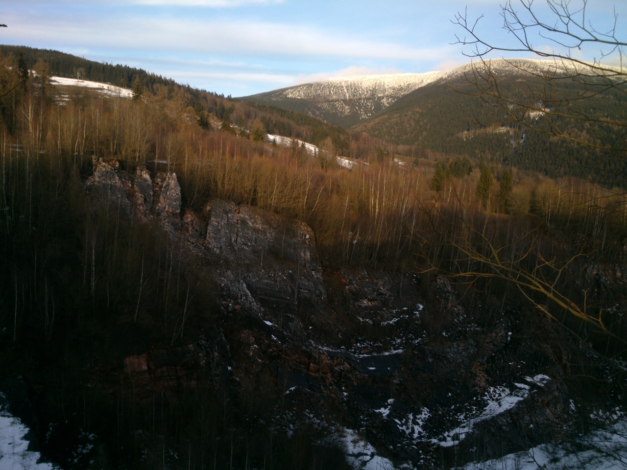 Dnes jsme se probudili do optimistického a rozjásaného dne. Sluníčko na modrém nebi zalévalo Krkonoše i jejich podhůří lázní svých paprsků. Proto jsme se rozhodli vydat ven na procházku, ale než jsme dojeli do našeho cíle - Horního Lánova k lomu, přivalila se mlha a sluníčko se v ní úplně utopilo.
