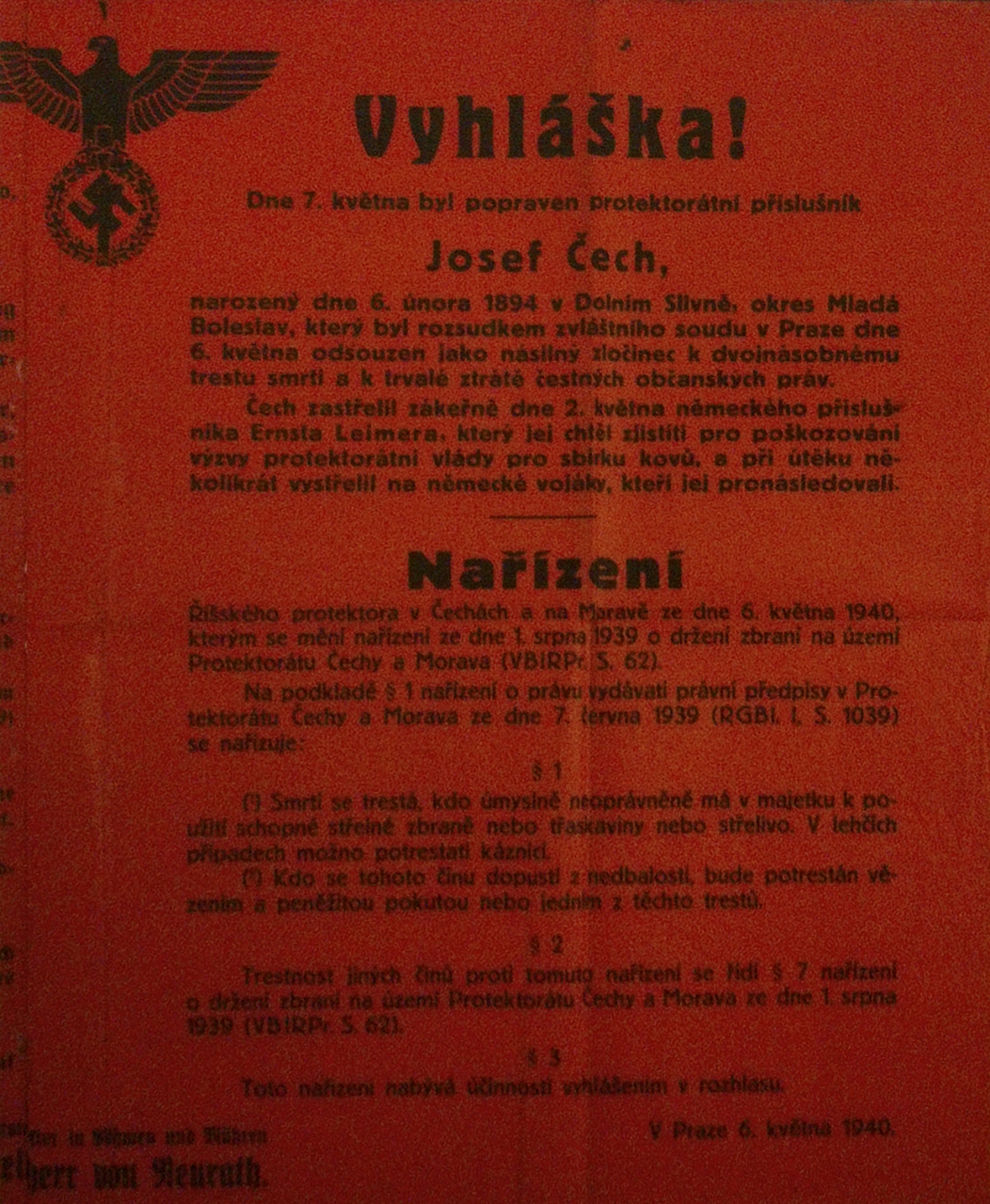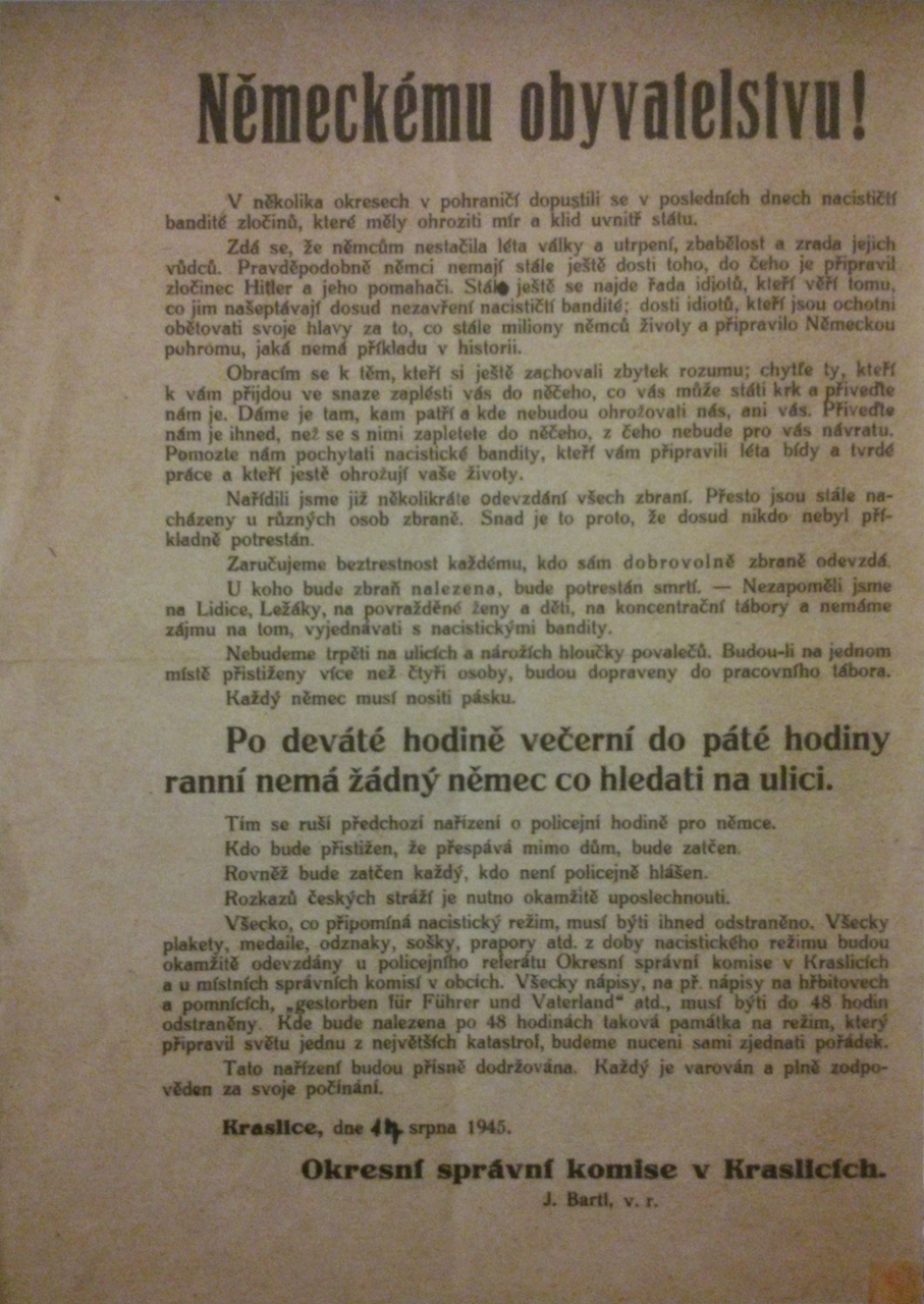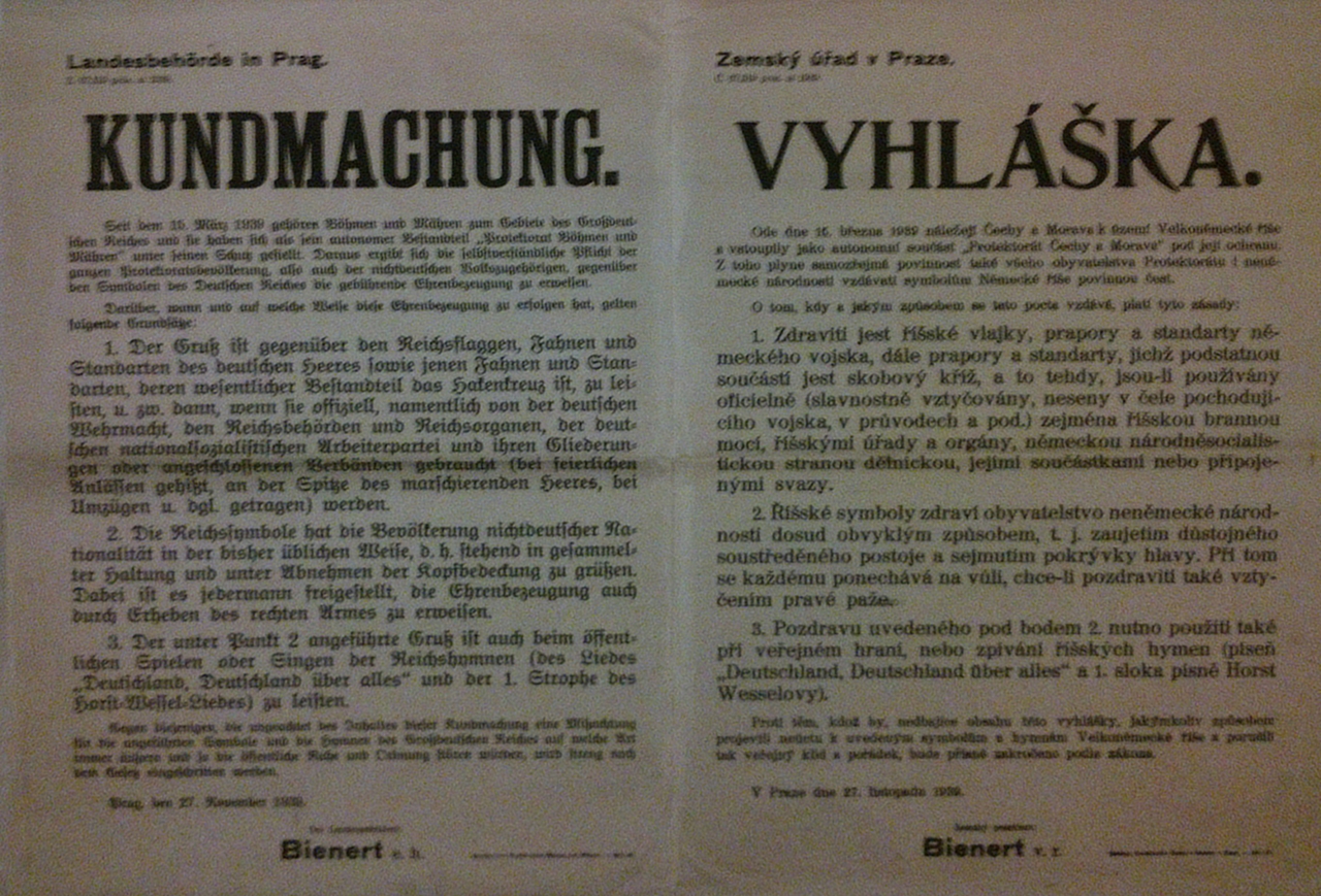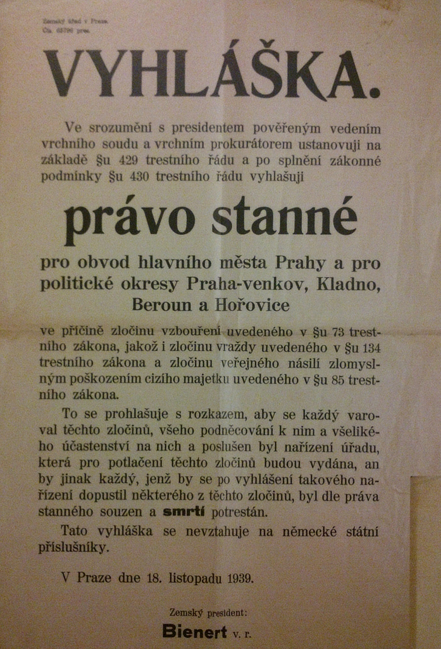 Vyhlášeno právo stanné - protektorátním příslušníkům zakázáno veškeré vraždění, ničení majetku a pobuřování pod trestem smrti. Německým příslušníkům pobuřování povoleno.