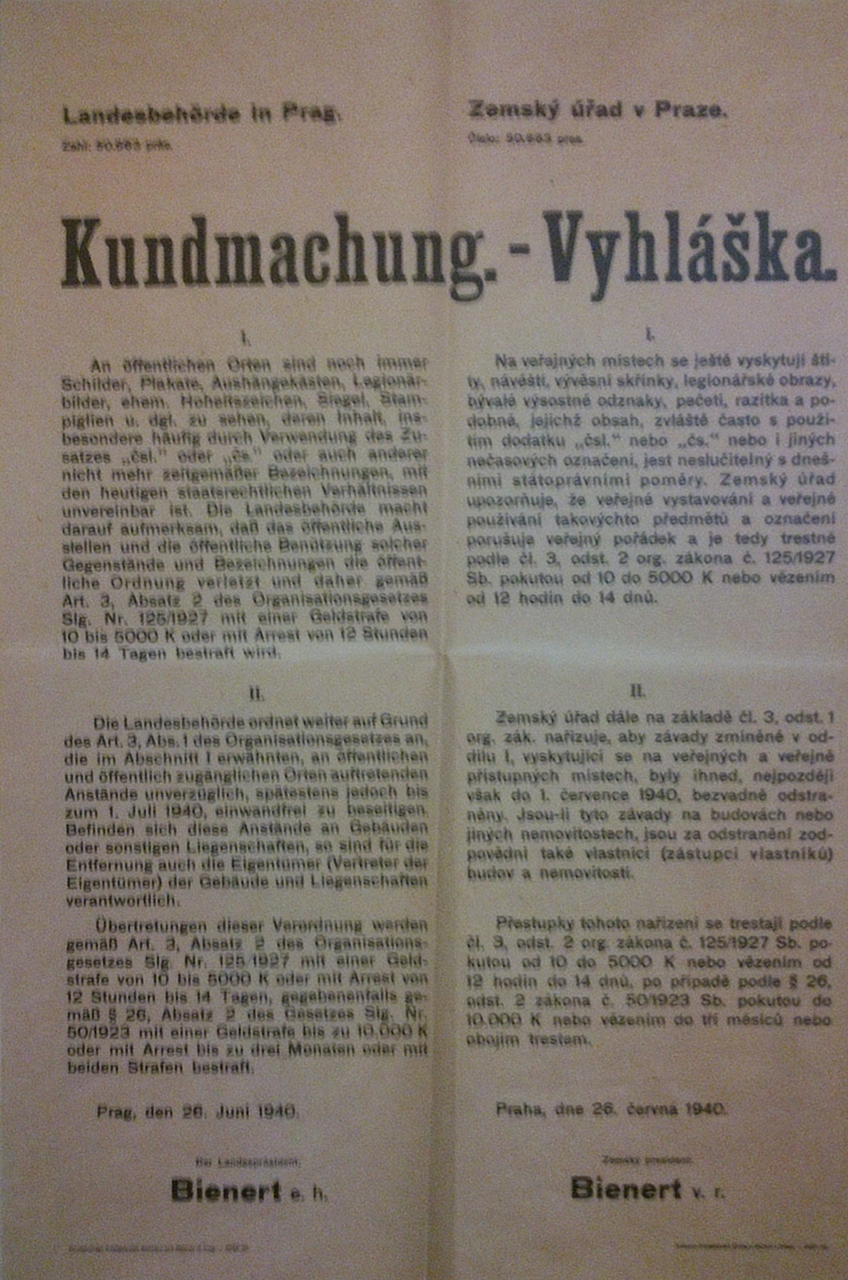 Tahle vyhláška hodně vyjadřuje atmosféru doby a vysvětluje, proč byla u nás ve Vrchlabí zcela vyškrábána německá prosba o ochranu k Panně Marii Pomocné - dnes obnovená i s českým překladem - nebo nápis z pomníku padlých v Městském parku.