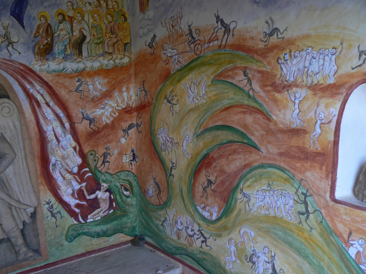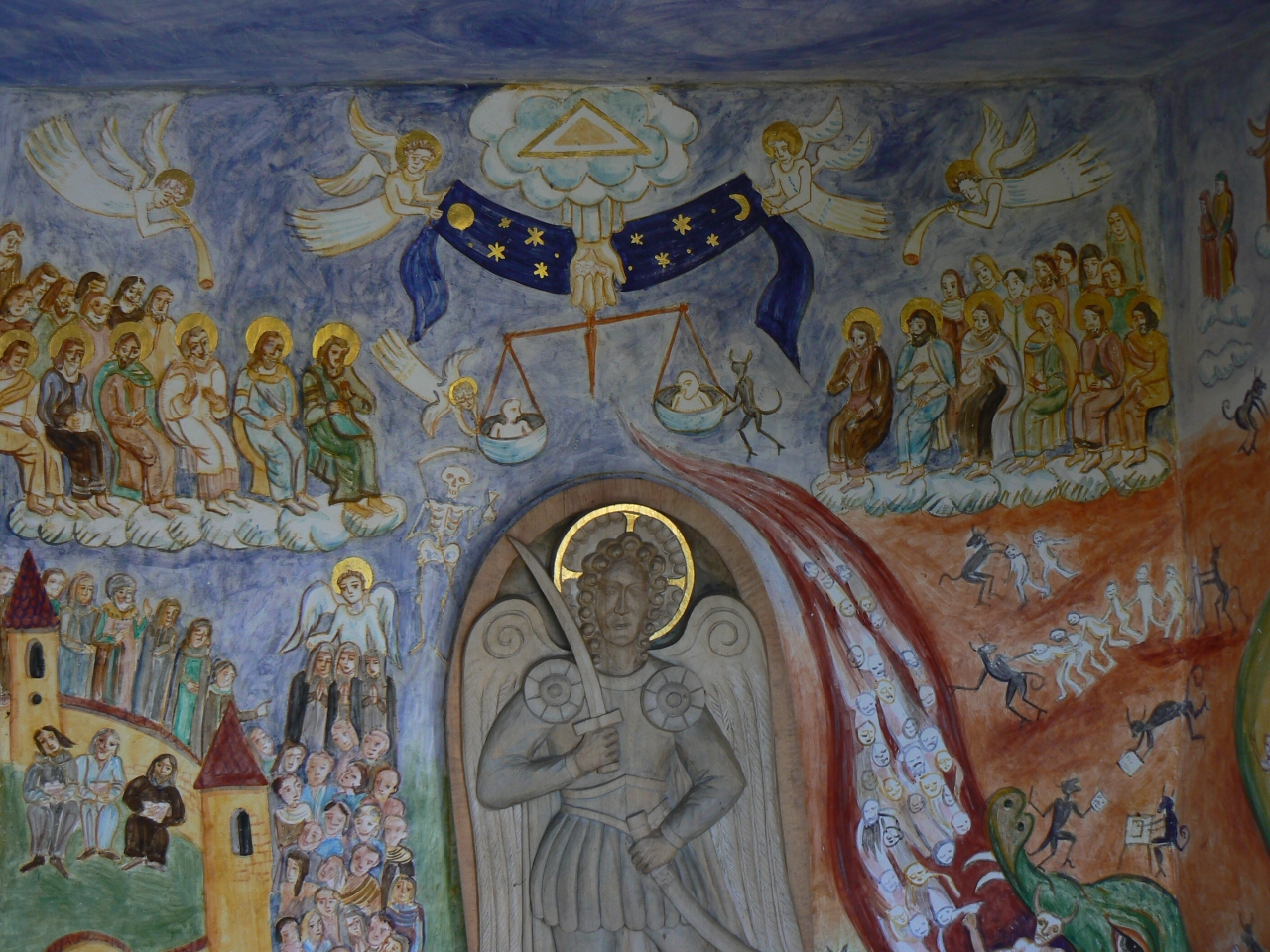Na hříšníky, sjíždějící po ohnivém jazyku šupem do pekla už čeká u brány pekelné sám ďabel a těší se už na ně i početní čertíci. Samotné hříšníky už to těší méně, protože je čeká bič a nekonečné orání v pluhu, nechybí ani ty klasické pekelné kotle. Není co závidět. Tak doufám, že se váhy skloní na tu správnou stranu.