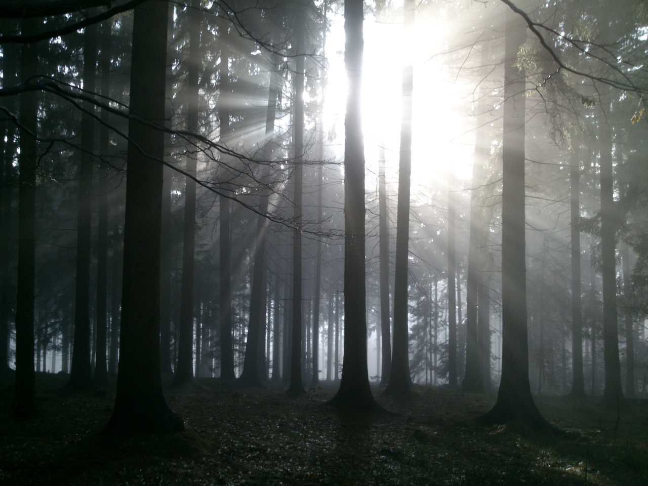 V údolíčku u lomu je mlha pořád, ale sluneční paprsky ji prosvětlují a mění každou kapku na stromech v zářivý diamant.