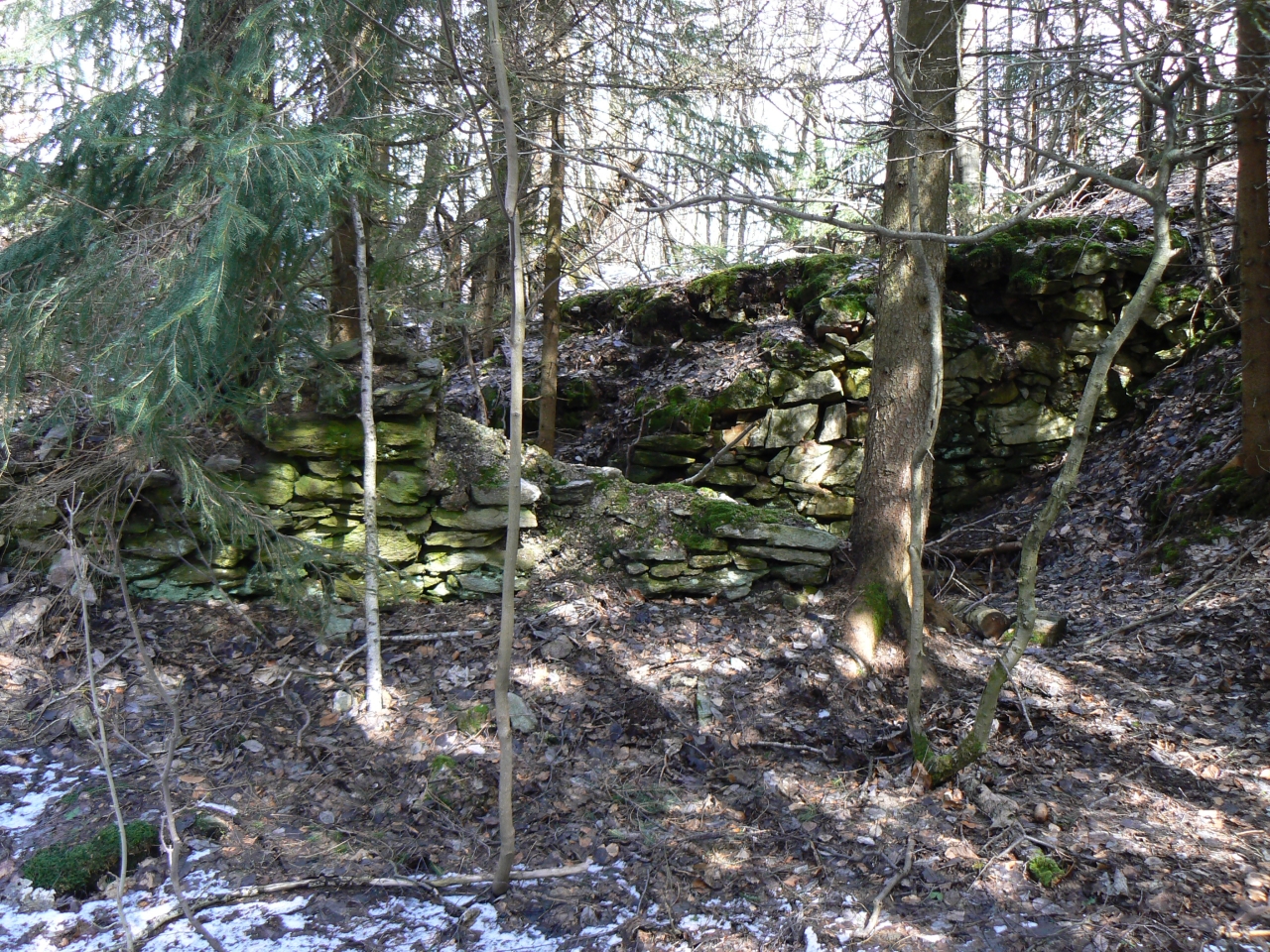 Za kapličkami se silnička vyhýbá hraně velkého vápencového lomu v Černém Dolu a proto sestupuje do mělkého a lesem zarostlého údolíčka. Zdá se, že tady byl možná kdysi počátek velkého lomu, stráň nad silničkou je zbrázděná, tyčí se z ní mechem porostlé skalky a mezi nimi nějaké nízké, bezejmenné trosky.