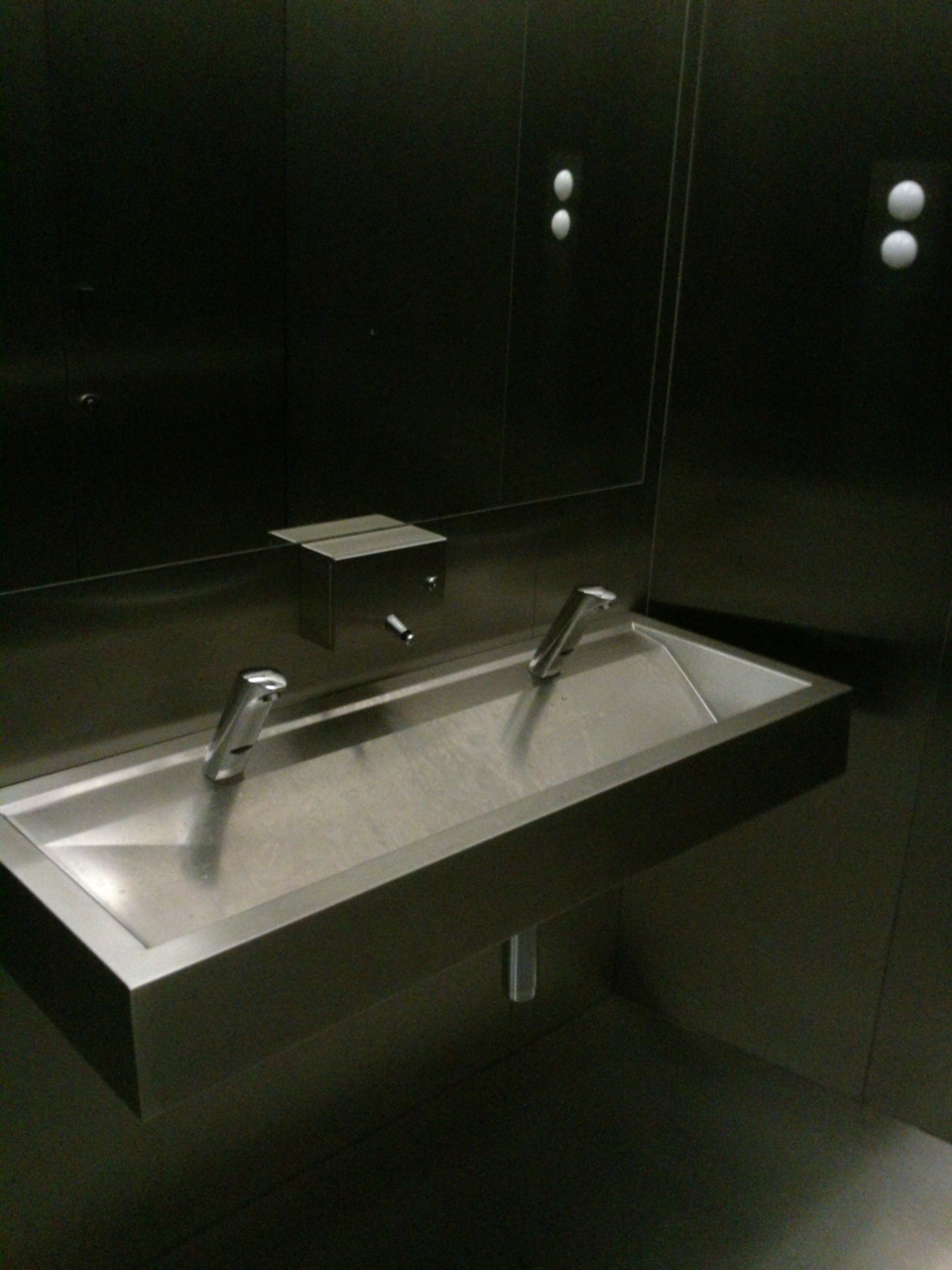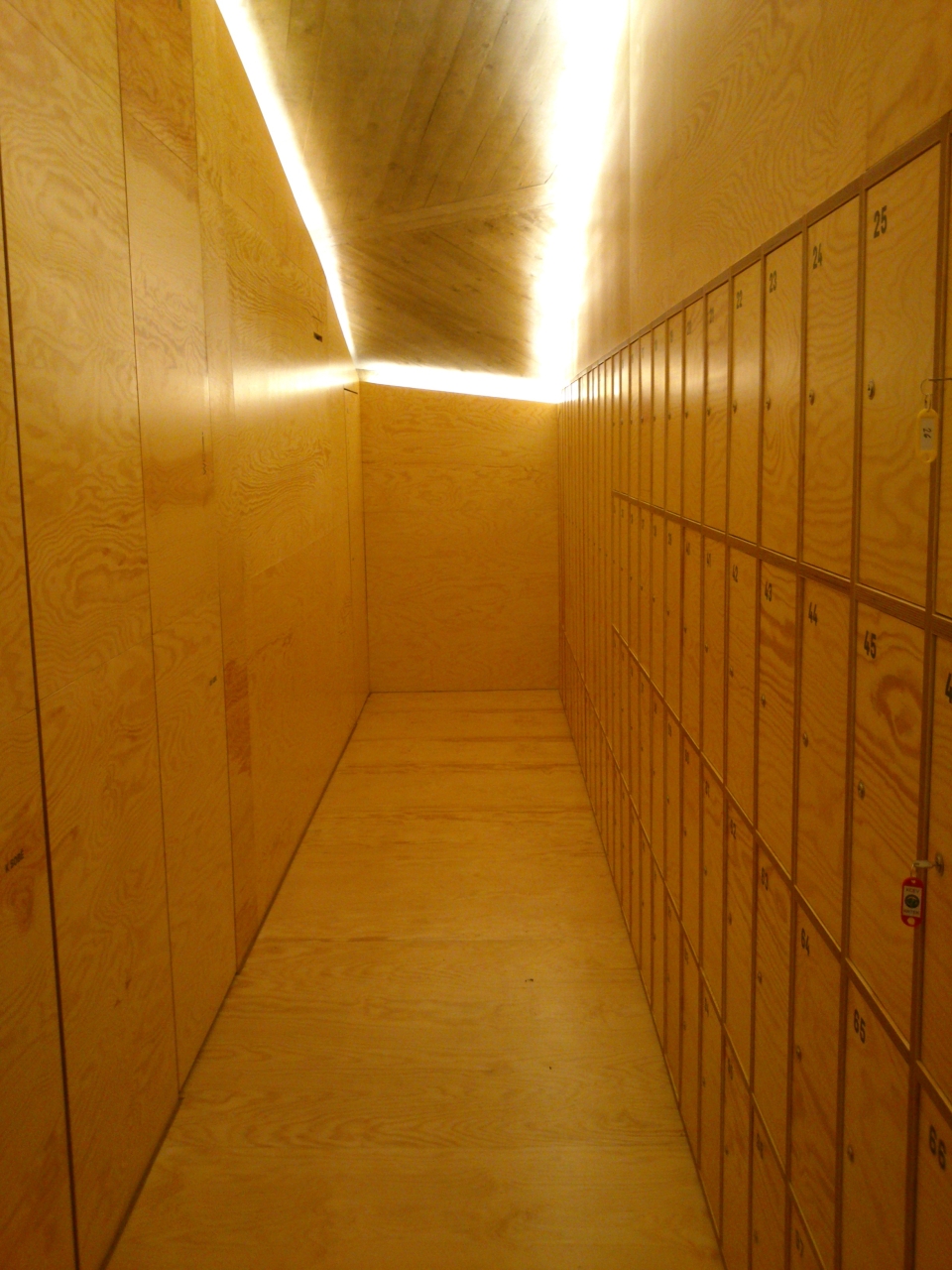 Uvnitř je to nádherné a architektonicky zajímavé a příjemné. Celá stavba připomíná dlouhý kosodelník, zaražený do země tak, že z něj čouhá na povrch jen malý kousek. Nad úrovní země je chodba s dveřmi na pánský a dámský záchod a spoustou skříněk...