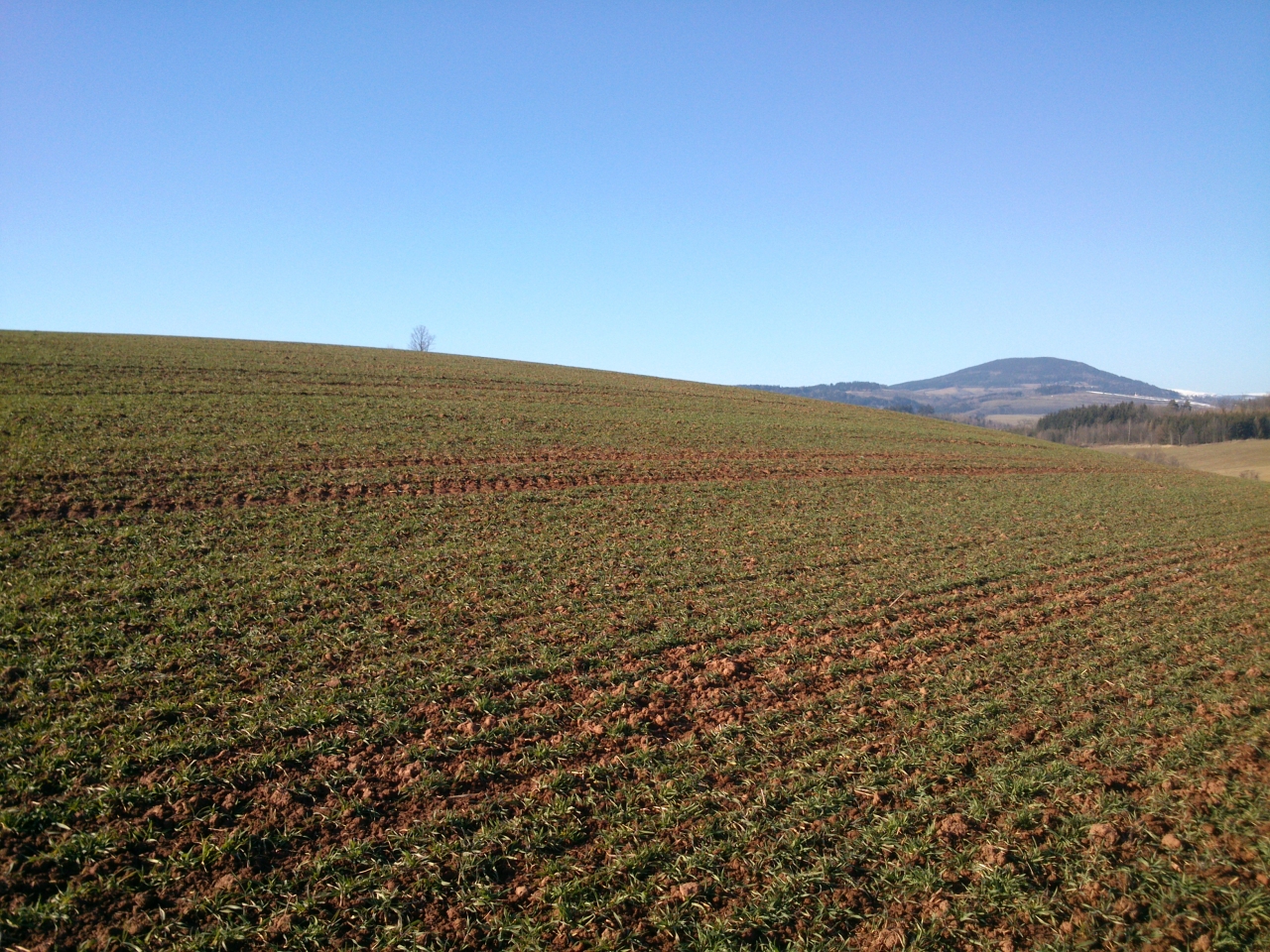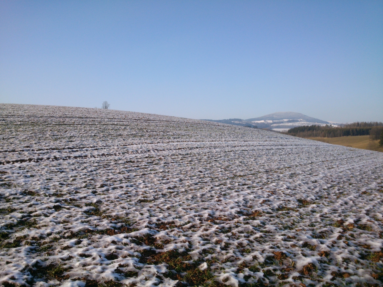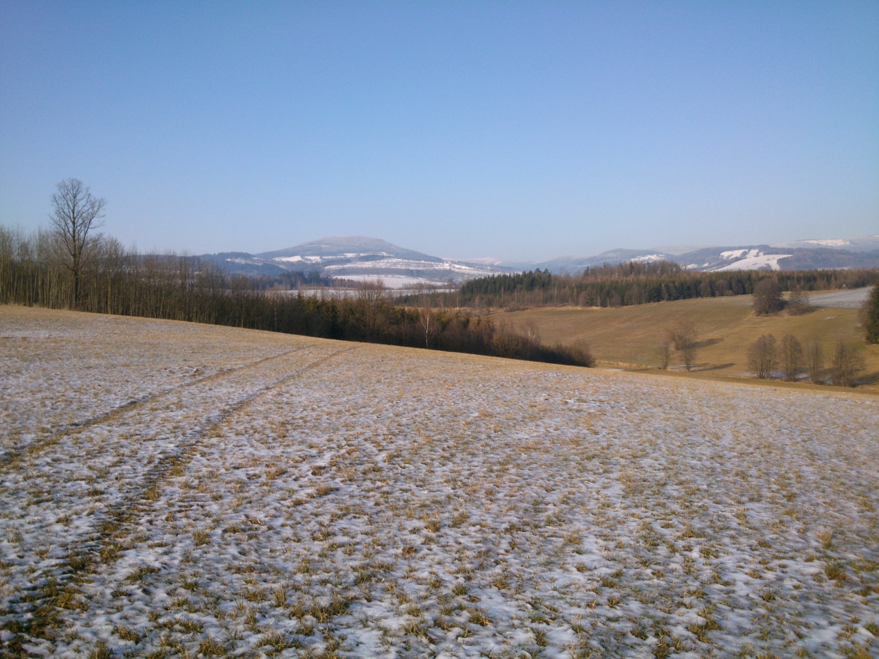 Hodím na sebe zimní oblečení a krásným zimním dnem jdu dlouhou a ne moc zajímavou cestou kolem rybníka a po silnici k Petříkovu mostu. Minu odbočku silnice na Horní Brannou a za chvíli už hledám na téže cestě, kde jsme minule skončili. Nenacházím však nic a tak přecházím zachumelené pole a stoupám na Kozinec. Naštěstí je sníh po mrazivých nocích a slunečných dnech tak umrzlý, že se dá po něm chodit, aniž bych se bořil, je to fajn chůze. Za chvíli jsem nahoře a po chvilce hledání narážím zaroslou cestu lesíkem na vrcholu a na ni hned dva docela dobře zachovalé zbytky značky. Po loukách a polích scházím do Horní Branné na křižovatku k zámku, kde hned nacházím další zbytky žluté značky. Vracím se po ní kousek zpátky, abych našel, kde přesně vycházela a pak pokračuju po silnici Horní Brannou. Betonových sloupů je všude podél cesty habaděj a zbytků značky se na nich zachovalo doopravdy hodně, dá se po nich jít skoro jako v dobách, kdy značka ještě existovala.