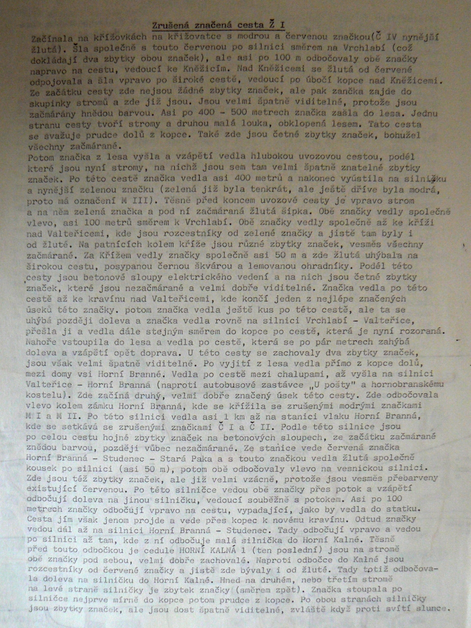 Kromě mých nejbližších byla tahle moje záliba pochopitelná pro málokoho. Pro mě to ale byla velká vášeň - do známé krajiny přinesla pro mě něco nového, nepoznaného. Zkoumání zrušených značek mě však vedlo i na neznámé cesty, do nepoznaných kopců a údolí a i když většina značených cest za to zase tak moc nestála a přinesla mi klackování po polích, prolézání kopřivami a po zarostlých cestách, některé cesty mě přivedly na krásná místa a mám je rád dodnes.