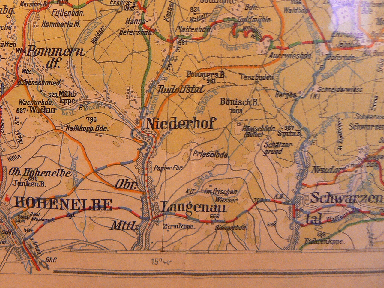 Ve starých mapách z prvních čtyřiceti let 20. století se značka objevuje modro-červeně čárkovaná - takhle dojbarevně značil cesty německý Krkonošský horský spolek.