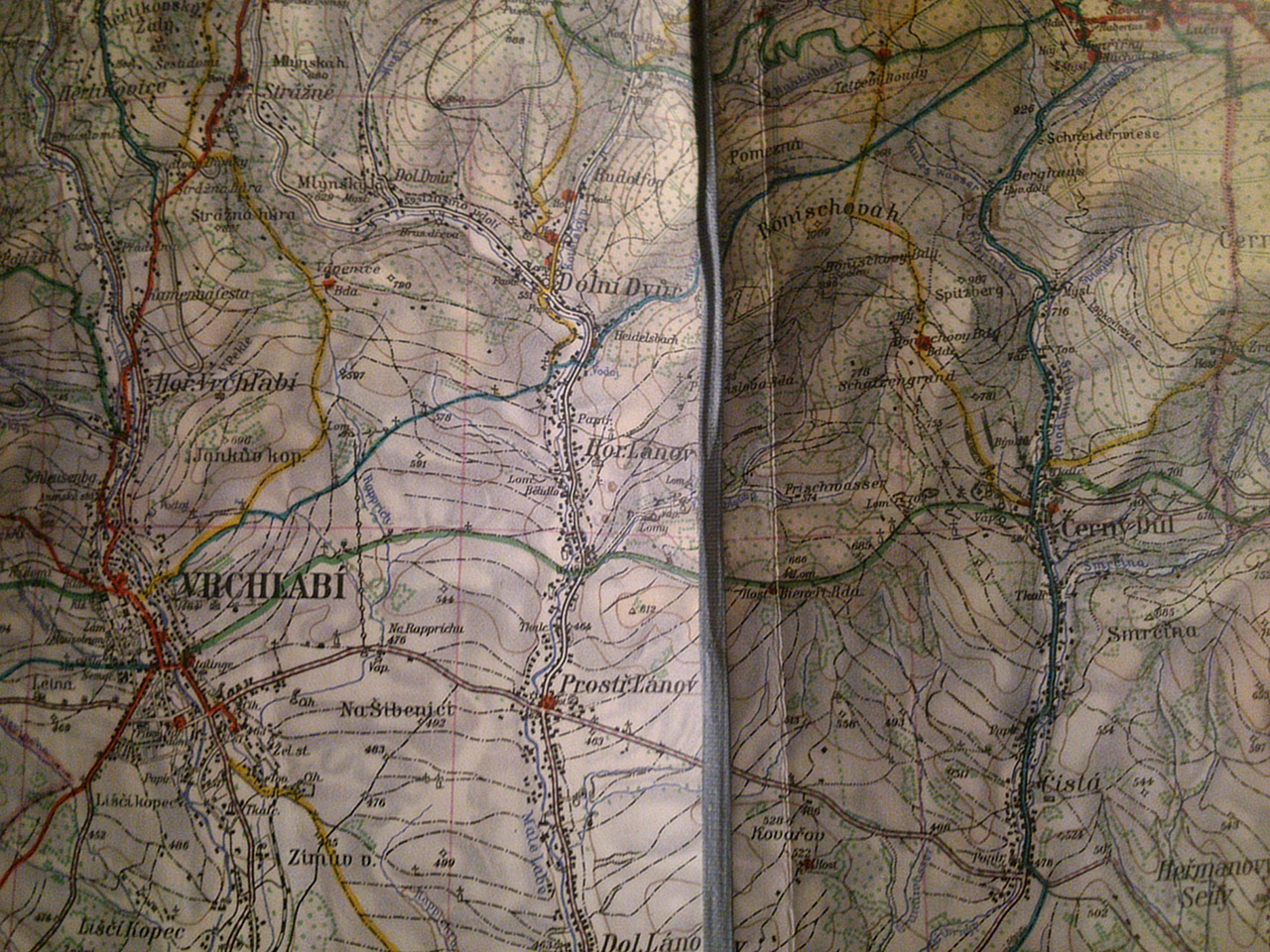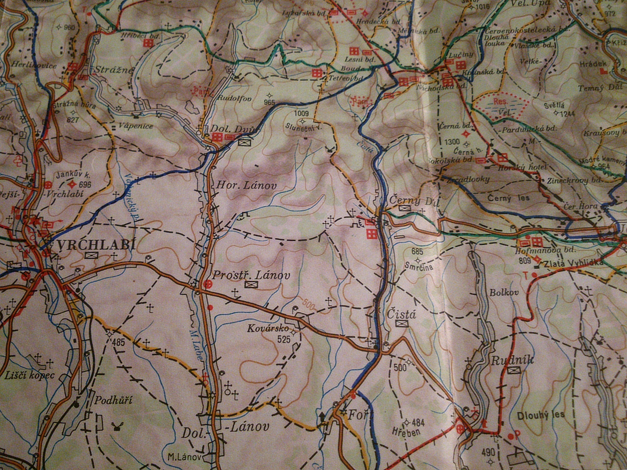 Skutečná vášeň však vzplála při poslední procházce nad Valteřice - podívali jsme se na mnou objevený zbytek značky a zkusili jsme po ní kus jít. Tahle značka však vypadá, že byla zrušená před kratší dobou než ta mezi Vrchlabím a Lánovem, zachovalo se z ní mnohem víc - jen na cestě od kříže nad Valteřicemi ke kravínu nad Vrchlabím jsme objevili několik dalších zbytků. Značka asi vedla do Horní Branné, ale kam z ní vedla dál? To ví jen staré mapy a jednu z nich doma máme. Mrkli jsme večer do ní - a tahle žlutá značka vedla z Kněžic až na Čisteckou hůru. To bude zkoumání! Není to však zdaleka všechno - červená značka, co dnes vede ze stanice vlaku Horní Branná do Staré Paky, kdysi začínala už ve Vrchlabí. Další zrušená značka!! Dnes tedy vyrážím zkoumat, kudy tyhle dvě značky přesně vedly.