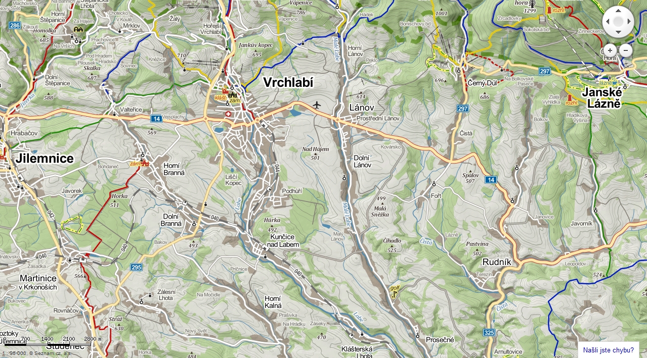 Od 2. února 1996 jsem měl novou zábavu - chození po dávno zrušených značených cestách a hledání zbytků značek s cílem zjistit, kudy přesně cesta vedla. Klub Českých turistů mi pro tuhle zábavu v okolí Vrchlabí připravil podmínku vskutku ideální. Tohle je současná mapa okolí Vrchlabí...