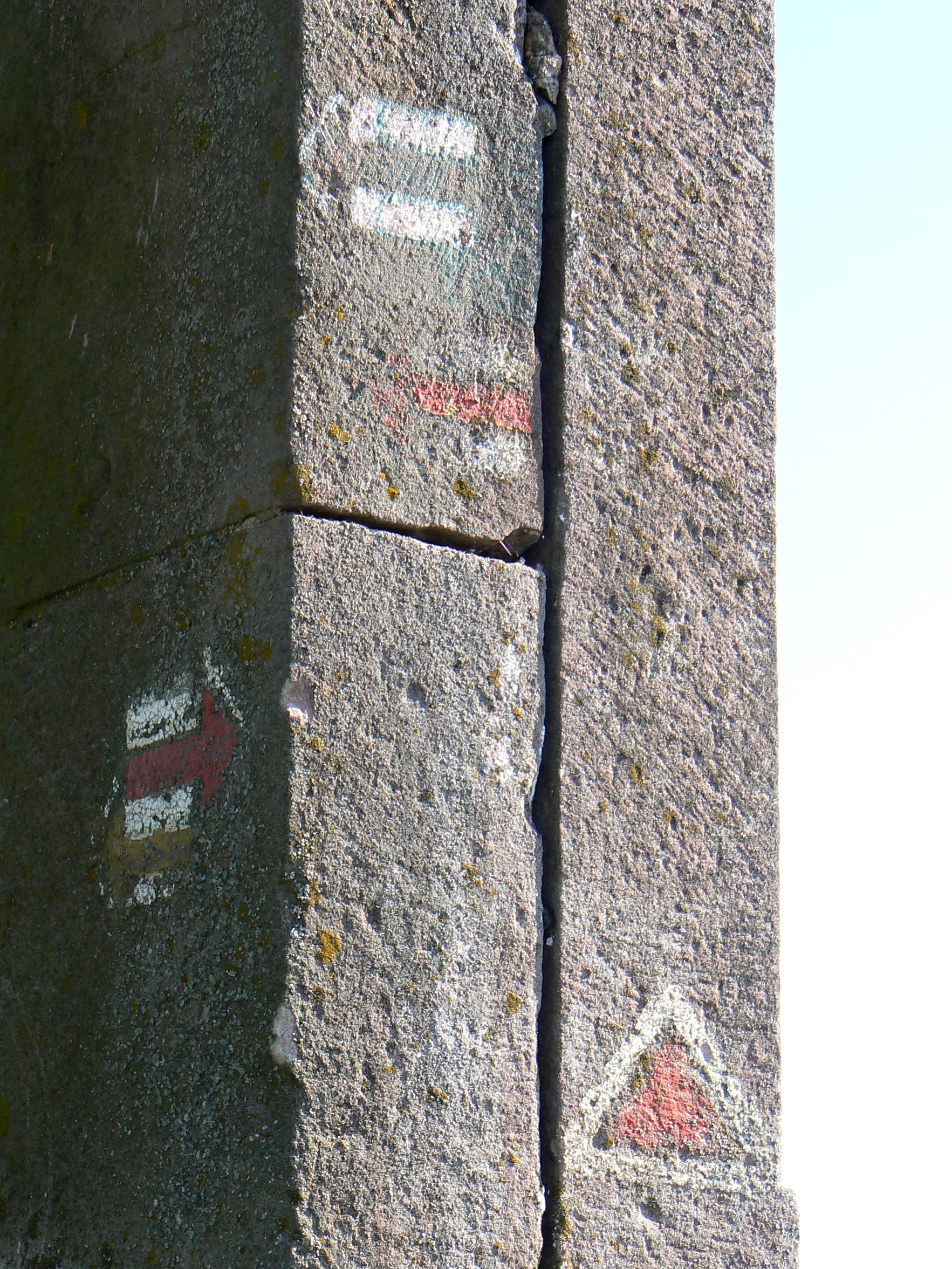 Zase uplynulo několik let a jednou mi tak při cestě okol padly oči na kamenný sloupek u plotu od Domova důchodců a na něm mě zaujal neobvykle obrovský zbytek žluté značky. Postupně jsem objevil druhý na protější straně u brány mé někdejší školky a tehdy poprvé mě napadlo po zrušené značce jít. Zpočátku byla cesta úspěšná - další zbytky značek se mi podařilo najít u železničního podjezdu při cestě na Šibeniční vrch. Ale horší to bylo pak - těžko se hledá, kudy chodili dávní turisté, když zemědělci všechny cesty rozorali a zničili. Proto bylo jen jisté, kam tahle žlutá značka vedla - do Lánova ke kostelu, na jehož bráně se zachoval další zbytek.