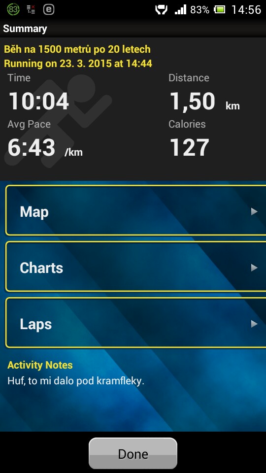 Ani nevím, proč jsem tak najednou začal vzpomínat na dávné hodiny tělocviku, ale vzpomínal jsem a to vedlo k bláznivému nápadu - zkusit si po 20ti letech běh na 1500 metrů. Nejlepší čas jsem měl asi 7:55, tak uvidíme, jestli se mi ho podaří překonat.