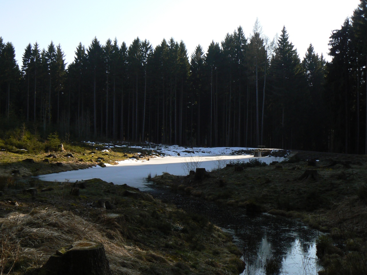 I když jsem to tady důkladně propátral, nenašel jsem nic. Zklamaně pokračuju po cestičce, křižuju širokou cestu pokrytou ledem a po rozblácené cestě pokračuju dál lesem se zbytky sněhu, kde ještě není ani jeden jarní kvítek. Dojdu na rozcestí několika cest, u kterého by měla být Jiránkova studánka - studánka v níž je tak dobrá voda, že si ji nechával vozit i hrabě Harrach. Koukám, ale nevidím vůbec nic. Krucinálhergotfagotklavír! Jestli ani ji nenajdu, tak už se doopravdy naštvu. Nic se dneska nedaří, vůbec nic.