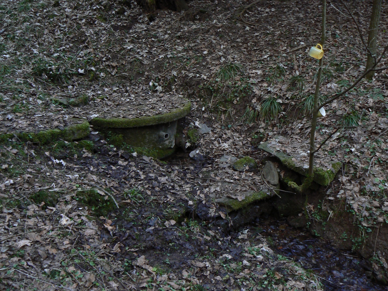 Brblaje a nadávaje jdu proti vodě, ale po kusu cesty dojdu jen k další cestě, za níž ta strouha plná vody pokračuje do nedohledna. Teď po jarním tání bude voda všude, takhle bych došel až do lesa Na Brabenci a bývalé hospodě Bohdance... tam se mi nechce, tak se vracím zpátky s úmyslem ještě jednou se podívat po studánce na místě, kde by měla být. Když přijdu znovu na rozcestí a vykročím po cestě dál, silné zurčení mě konečně nasměruje do správného místa.