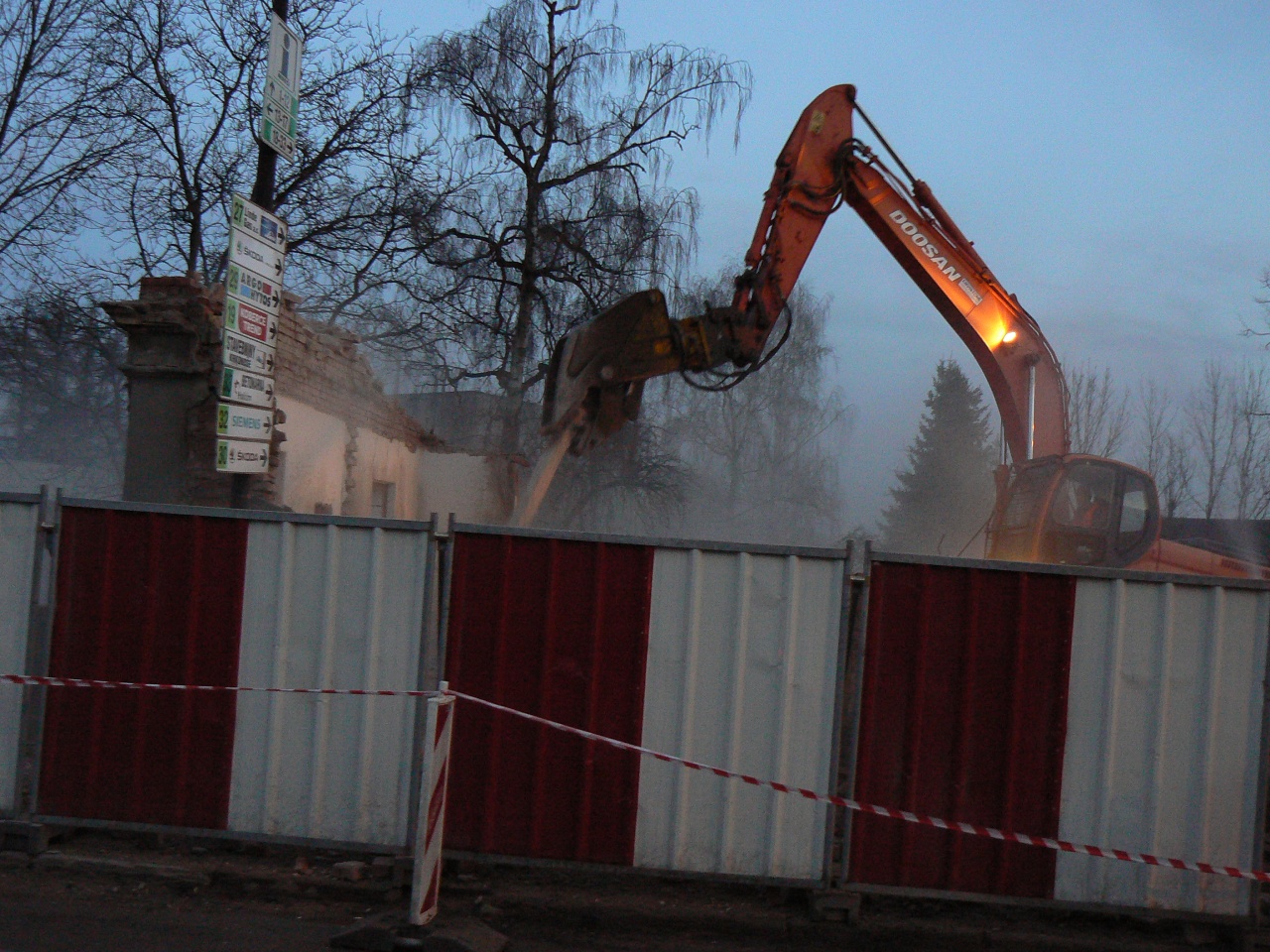 Místo lžíce se na konci ramene bagru ocitl nástroj, podobný obrovským kleštím, který z podlahy prvního patra domu vytrhává trám po trámu, jako by dům byl z perníku.