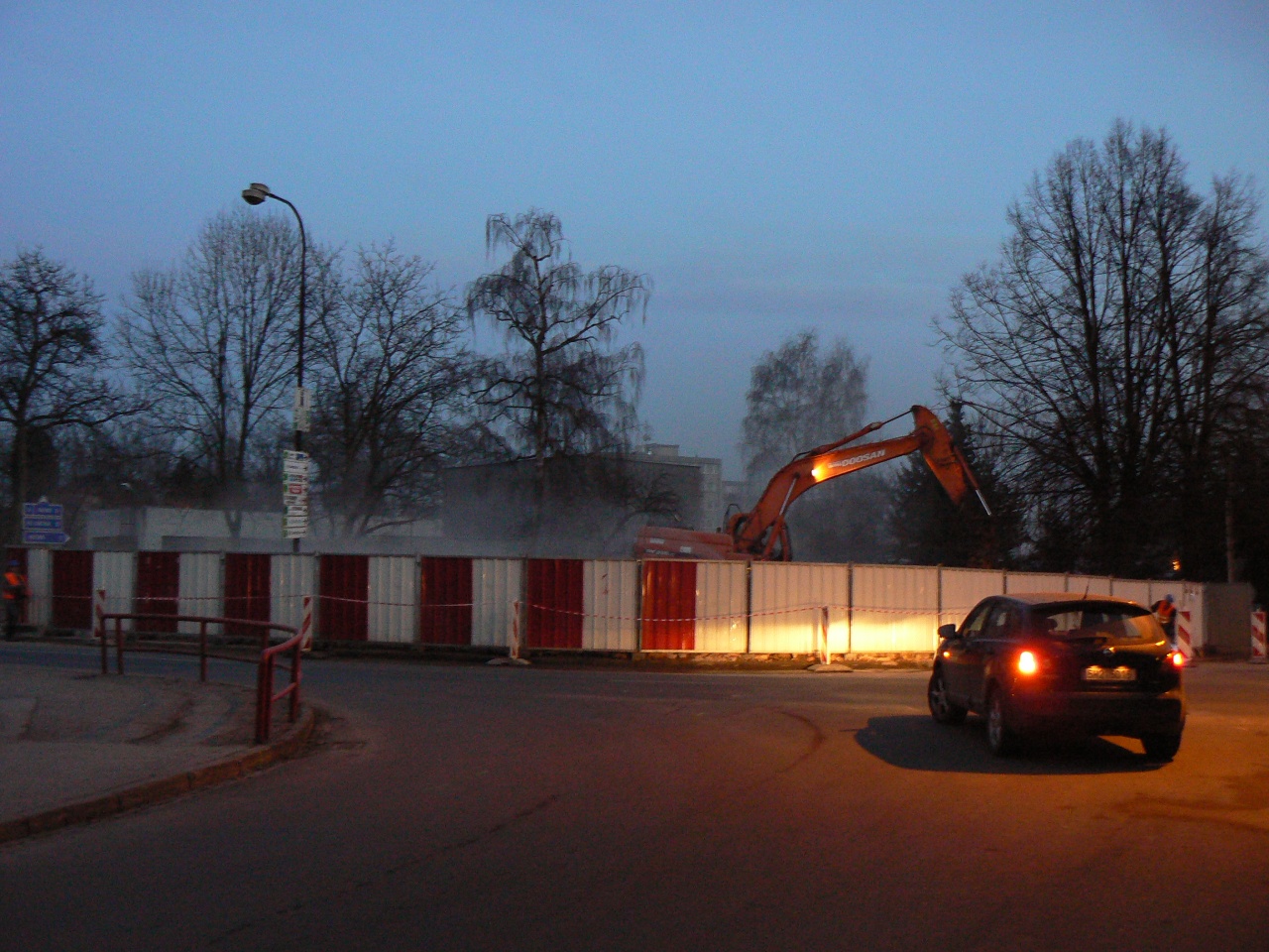 Jde to strhujícím tempem. Pro lidi je to atraktivním podívaná, na opačné straně ulice se zastavují, dívají, fotografují, mnoho lidí se také dívá na Internetu na webkameru firmy Comanet, kterou tu zřídili pro živé sledování celé stavby. I řidiči se dívají - teď se jedna paní dívala a jen taktak ubrzdila své auto, aby nenarazila do pána před ní, který si za stejným účelem dokonce přibrzdil.