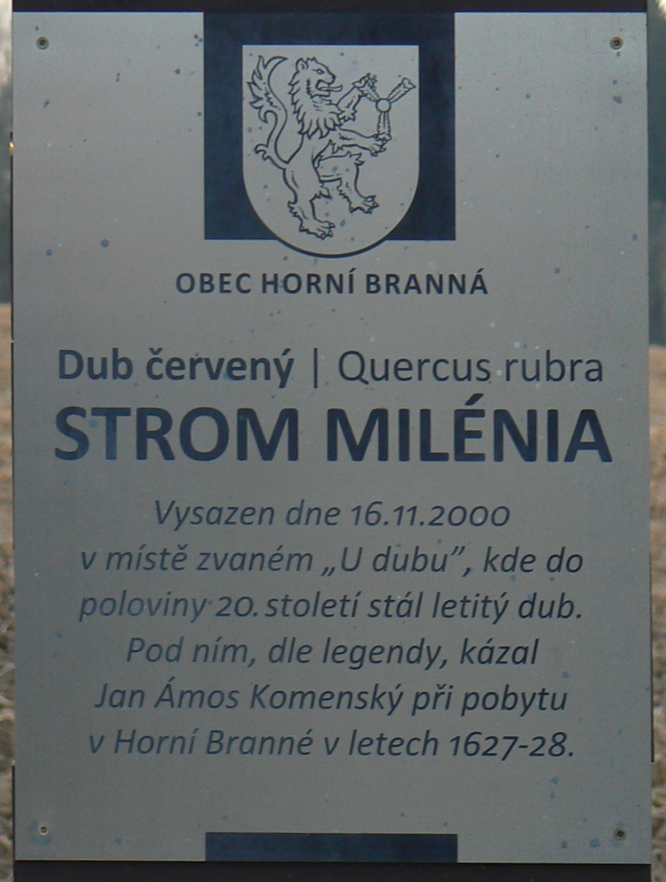 Už spokojenější jdu od Jiránkovy studánky bludištěm lesních cest až k okraji lesa a v údolí Bohdanečského potoka si čistím zablácené boty v posledních zbytcích sněhu. Zaujme mě úplně zbrusu nová silnička, kousek po ní jdu, ale zavedla by mě tam kam nechci, proto se vracím a po zámecké cestě jdu dál směrem k Horní Branné. Po cestě mě zaujme zajímavá cedulka u mladého doubku.