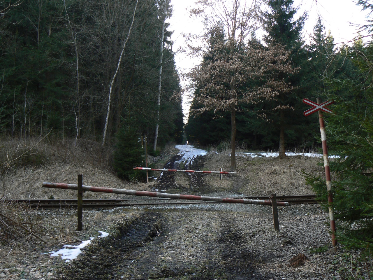 ...až k železničnímu přejezdu, který působí překvapivě opuštěným dojmem. Jen kříž a dvě závory, které si musí každý zájemce o přejetí sám zvednout a po přejetí zase spustit. Trať však není opuštěná ani trochu...