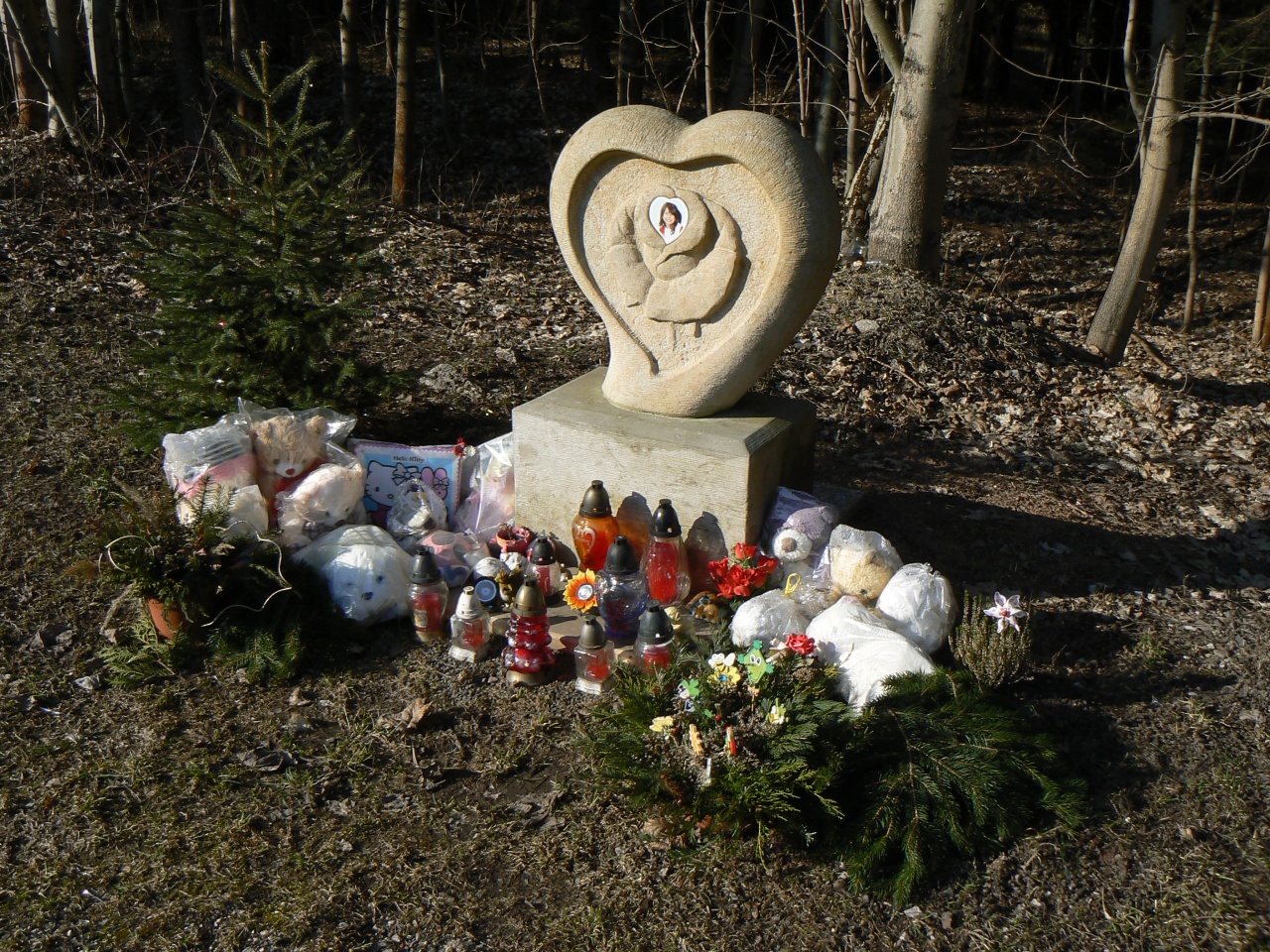 ...pomníček na památku holčičky, která na tomhle zakletém místě přišla před pár lety o život při dopravní nehodě. Vypadá jako velké srdce, v něm kamenný kvítek a v jeho středu obrázek holčičky ve tvaru srdíčka... kolem spousta světýlek, hračky, několik třpytivých třásniček na vedlejším smrčku svěčí o tom, že byl ustrojený jako vánoční stromeček... tvary, siluety a linie rozmazávají slzy, deroucí se mi do očí. Zapaluju tu světýlko, přidávám modlitbu... a pokračuju v chůzi po lesní cestě do nitra hlubokého lesa. Mým cílem je místo, na Mapy.cz označeno jménem „Kamenný kříž“.
