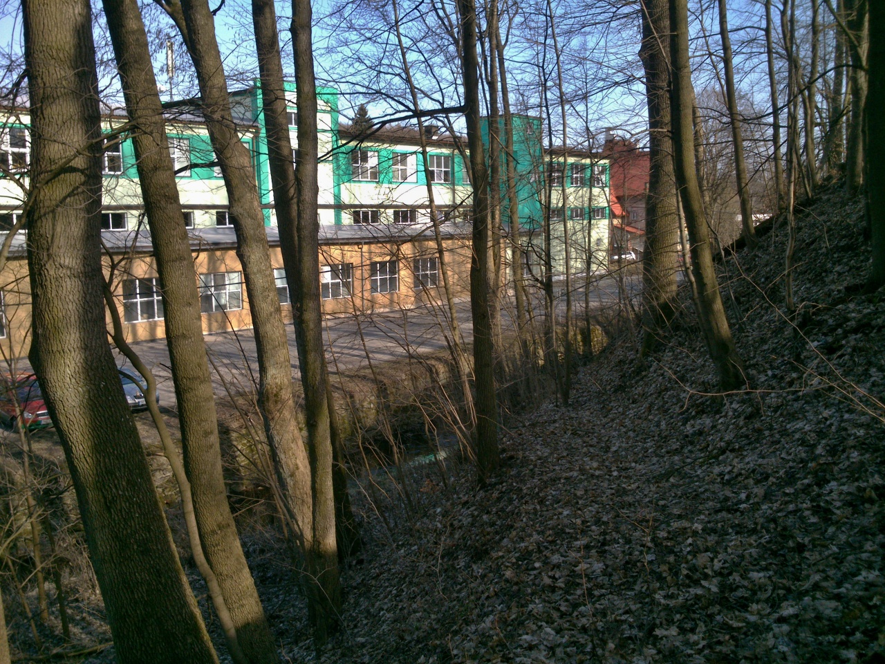 Teď spolu stoupáme po cestě, jíž sice kupodivu plány Branné stále znají, ale nikdo tu už dávno nejezdí ani nechodí. Vidět je odtud náš podnik neobvykle, ale není to obrázek zrovna na firemní stránku.