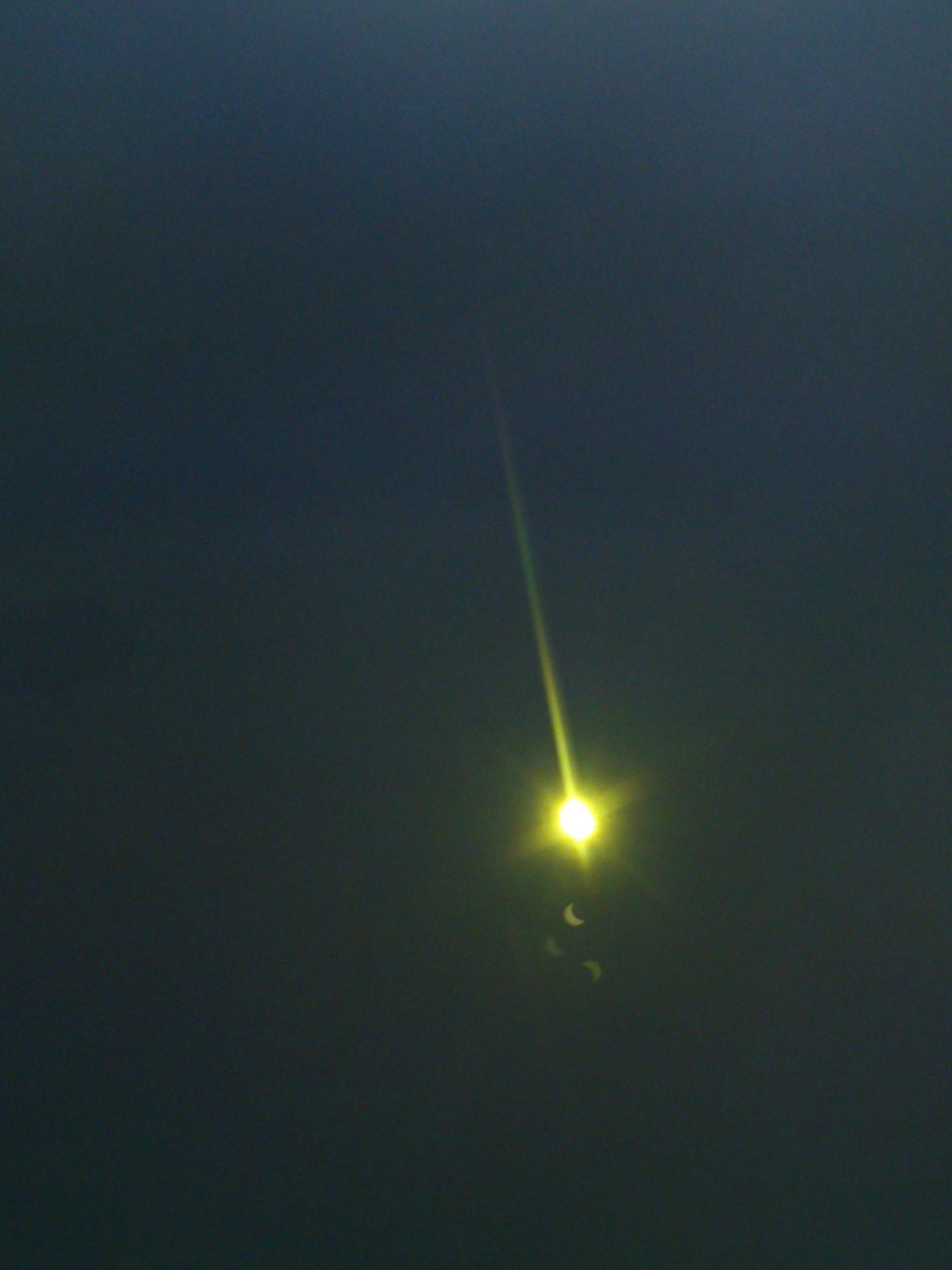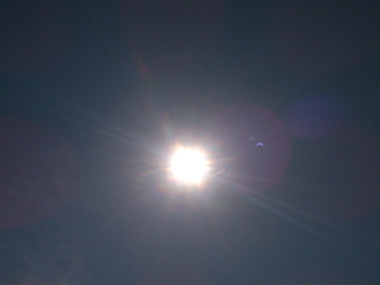 Je 10:45. Sluníčko nám skoro celé zmizelo a zbyl z něho jen úzký ležatý srpek. Snažím se znovu fotografovat, ale je to marné, je to marné, je to marné. Jen na jednom obrázku je zatmění vidět převráceně v odrazu od objektivu.