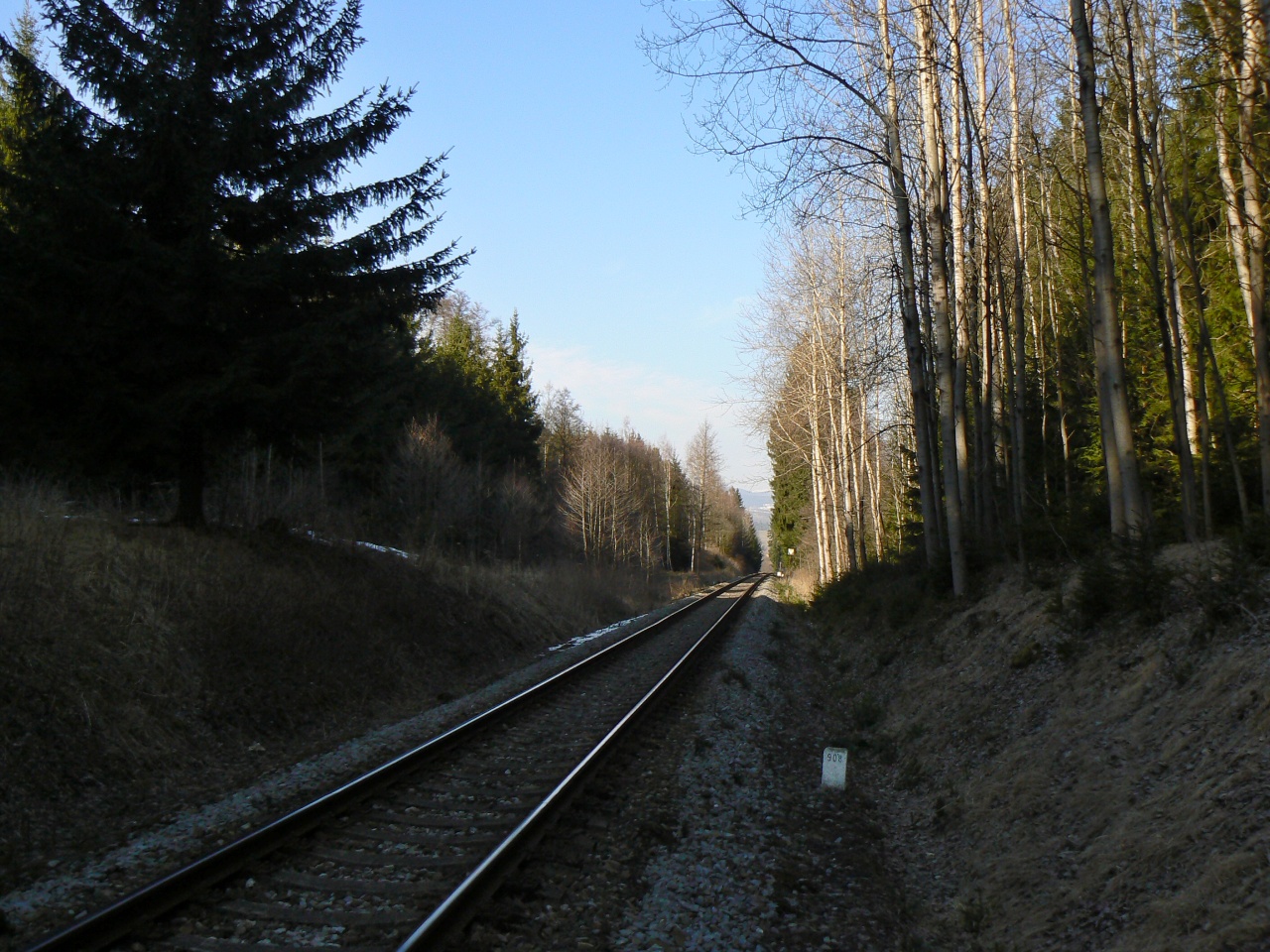 Konečně vidím místo, kam jsem chtěl lesem dojít... žel Bohu je o takových 20 metrů prudké stráně níž než já. Čtvrtá hodina už dávno minula, spolužačka Vlaďka vysílá pátrače po mně v podobě tázavé SMSky, ujišťuju ji, že přijdu, jen co se vybloudím z toho lesa, odpovědí je spokojený usměváček. Spokojený jsem i já - stromů naštěstí na stráni rostlo dost na to, abych se prostřednictvím jejich kmenů spustil dolů, za chvíli už přecházím železniční přejezd a kolem vlakové zastávky HOSTINNÉ MĚSTO přicházím do Hostinného.