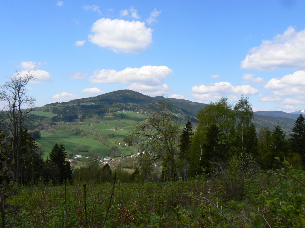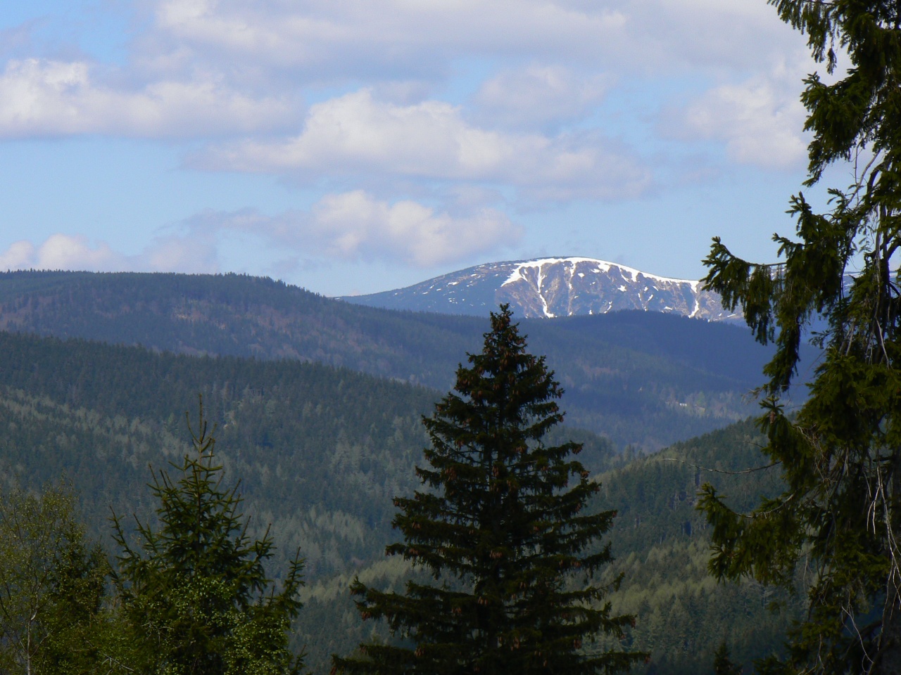 Stačí popojít jen pár kroků a i když většinu výhledu na hory zastiňuje les, je hezky odtud vidět Žalý.