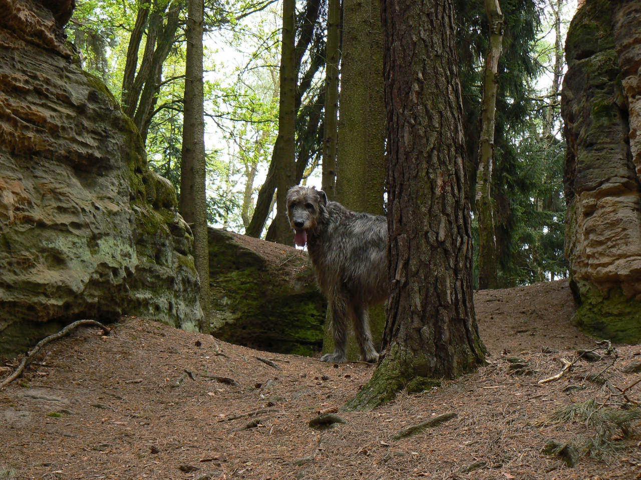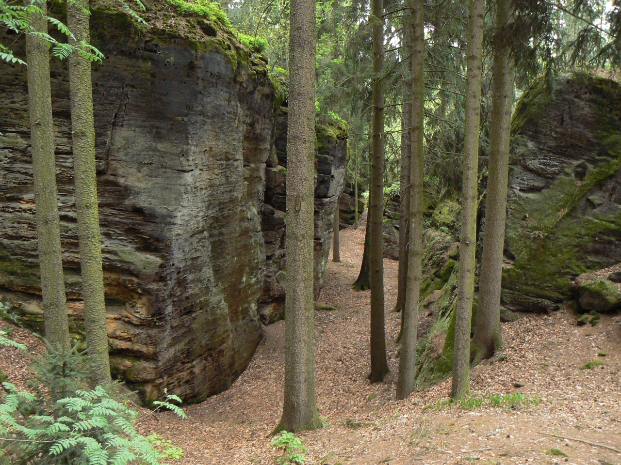 ...opouštíme Mnichovo Hradiště, jedeme po dálnici, hlavní silnici, vedlejší, ještě menší... až dojedeme do úhledné vesničky s hezkým jménem Kadeřavec. Za posledními domy se hroužíme do lesa, v bludišti cestiček úspěšně nacházíme žlutou značku a ta nás po kratším prudším stoupání přivádí do pozoruhodného bludiště skal.
