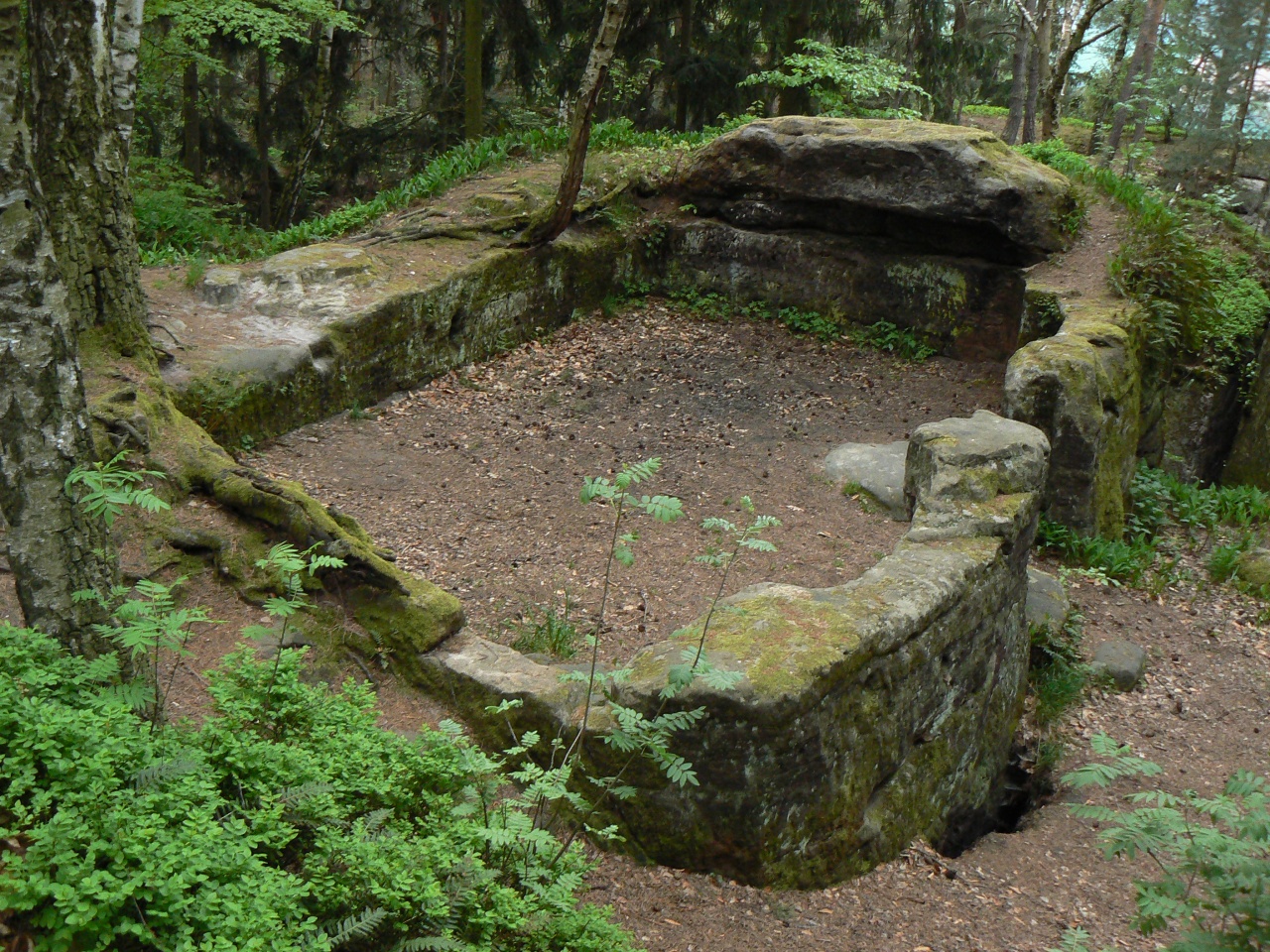Bludiště skalních údolíček a roklí obklopuje skalnatý vršek - ideální místo na vybudování skrytého a obtížně dobytného hradu. Hradby zčásti obstarala sama příroda, zbytek stačí zahradit dřevěnými palisádami, ani palác není třeba nějak zdlouhavě stavět, stačí ho vytesat do kamene... a je hrad k pohledání. Míst na okolních skalách habaděj pro obránce...