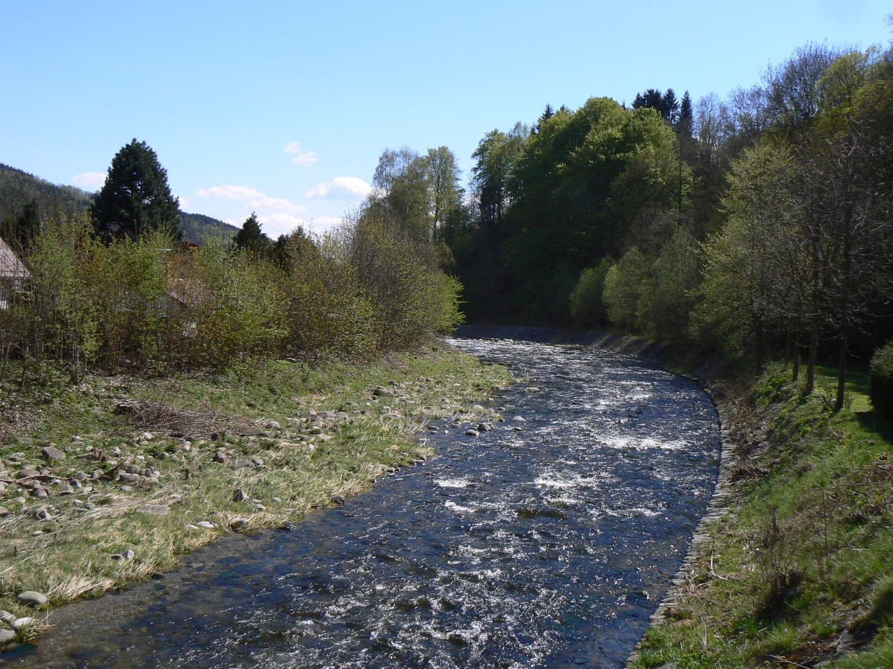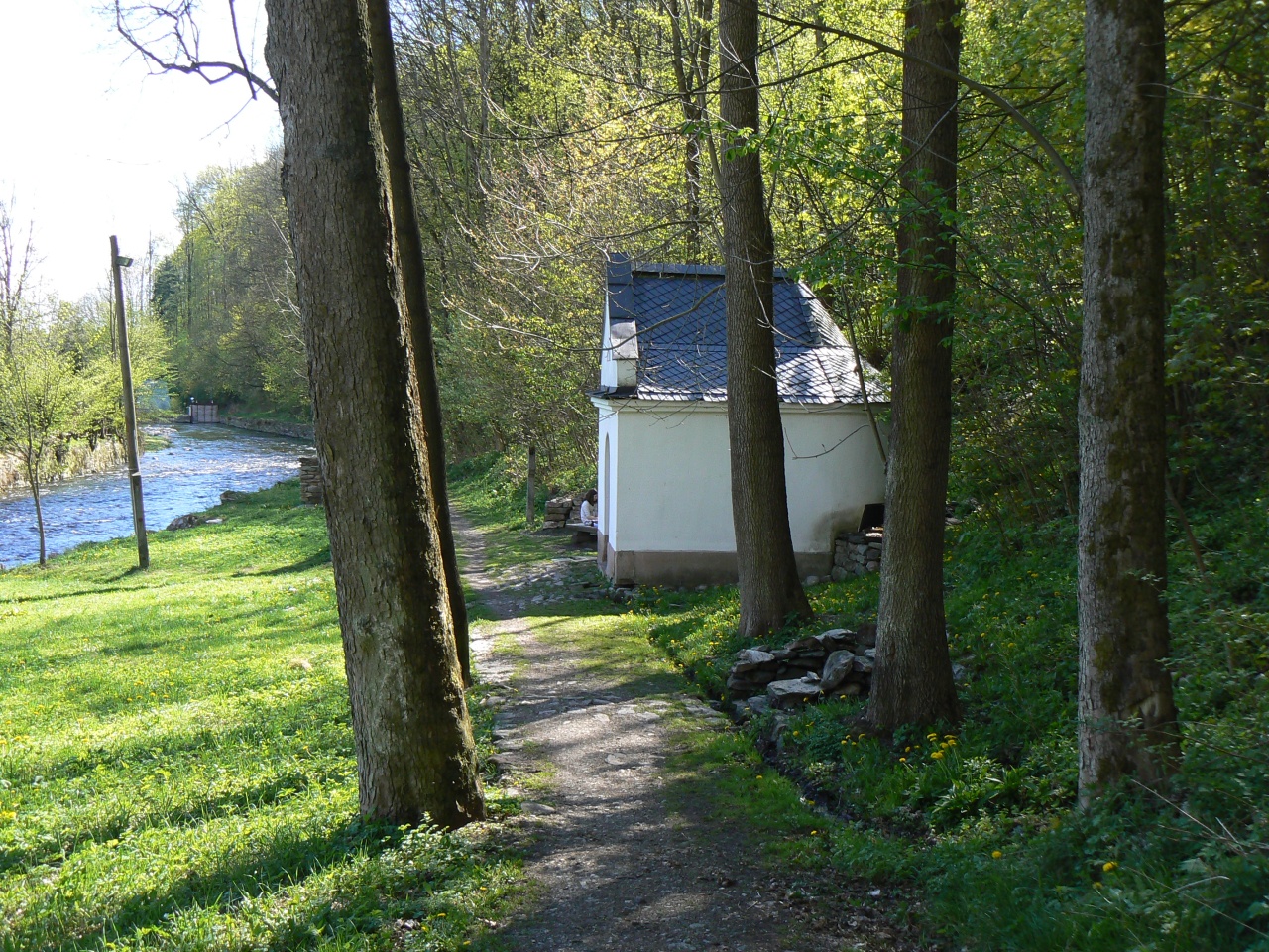 Přecházíme silnici, vedoucí údolím Hamerského potoka na Křížovky a pokračuje dál podél Labe kolem staré a stále funkční elektrárny a po příjemné pěšině až ke studánce svaté Anny.